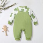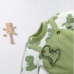 Een prachtige tweedelige romperset voor pasgeborenen met een speels kikkerthema, een groene romper in overall-stijl en een ondershirt met lange mouwen met patroon.