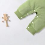 Een charmante bodysuit voor pasgeborenen, perfect voor een kleine jongen. De set bestaat uit twee stukken die ontworpen zijn om zowel stijl als comfort te bieden. De overall-stijl bodysuit wordt gepresenteerd in een rustgevende tint groen en is voorzien van speelse details zoals een lachend kikkergezichtje op de borst en complementaire messingkleurige drukknopen die niet alleen een decoratief tintje geven, maar ook zorgen voor gemakkelijk aankleden. Bij de overall hoort een ondershirt met lange mouwen, versierd met een herhalend patroon van vrolijke groene kikkers en waterlelies, wat het speelse kikkervijverthema versterkt. Het outfitje is gemaakt van een zachte, ademende stof, perfect om de baby de hele dag comfortabel te houden. Met geribde manchetten bij de polsen en enkels is de bodysuit ontworpen om op zijn plaats te blijven en toch gemakkelijk te kunnen bewegen. Deze schattige set is een praktische keuze voor dagelijks gebruik en combineert functionaliteit met een vleugje plezier.