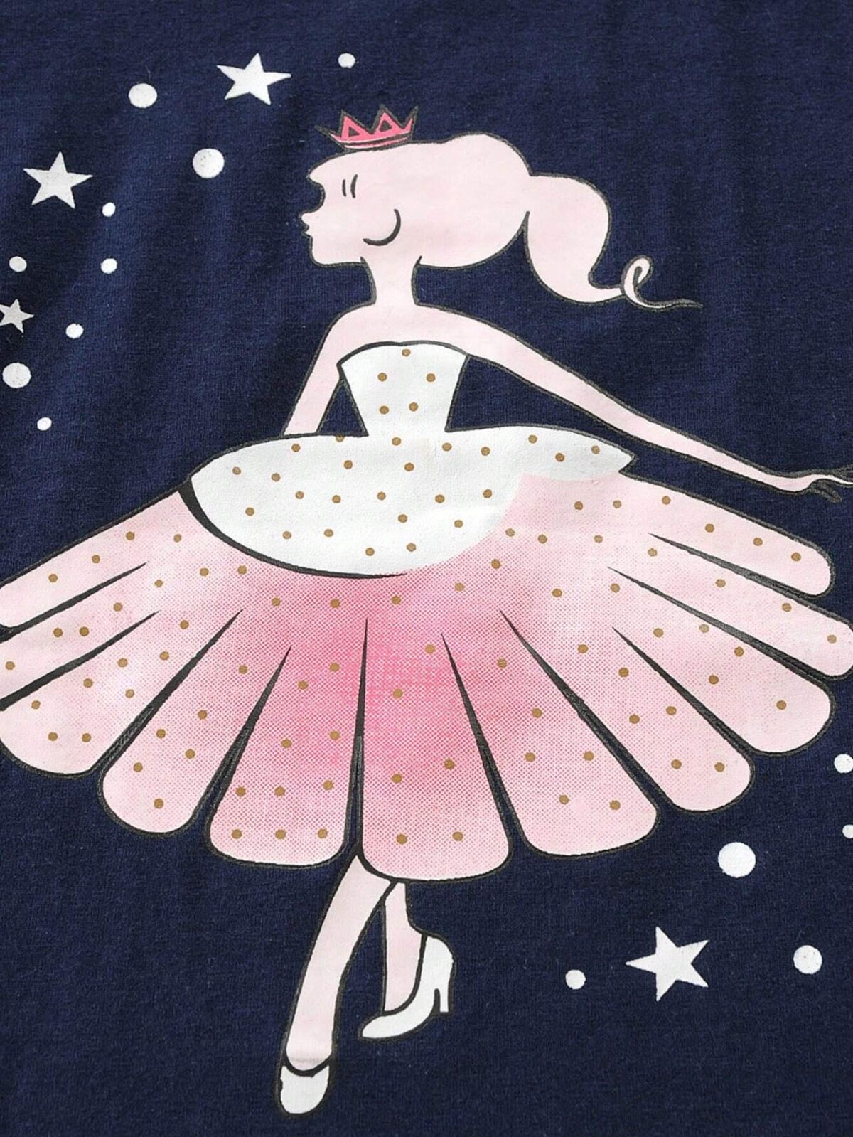 Stuur je kleine meisje naar dromenland in deze betoverende pyjamaset die zowel speels als gezellig is. De marineblauwe top heeft een delicate ballerina-illustratie, versierd met een sprankelende tiara en een fladderende tutu, omgeven door een waterval van sterren. De bijpassende broek is een hemels wonder, bezaaid met witte sterren van verschillende groottes, die lijken op een heldere nachtelijke hemel. Deze set is gemaakt van zachte, zachte stof voor een comfortabele nachtrust en is perfect voor het koesteren van zoete dromen en de verbeeldingskracht van je beginnende danser. Of het nu voor een goede nachtrust of een luie weekendochtend is, deze pyjama combineert comfort en magie, zodat uw kleintje zich de ster van haar eigen sprookje voelt.