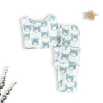Dit is een aantrekkelijke jongens pyjamaset met een lichtblauw beer patroon op zowel het gezellige shirt met lange mouwen als de bijpassende broek, compleet met een schattige beer gezicht applicatie op de borst.