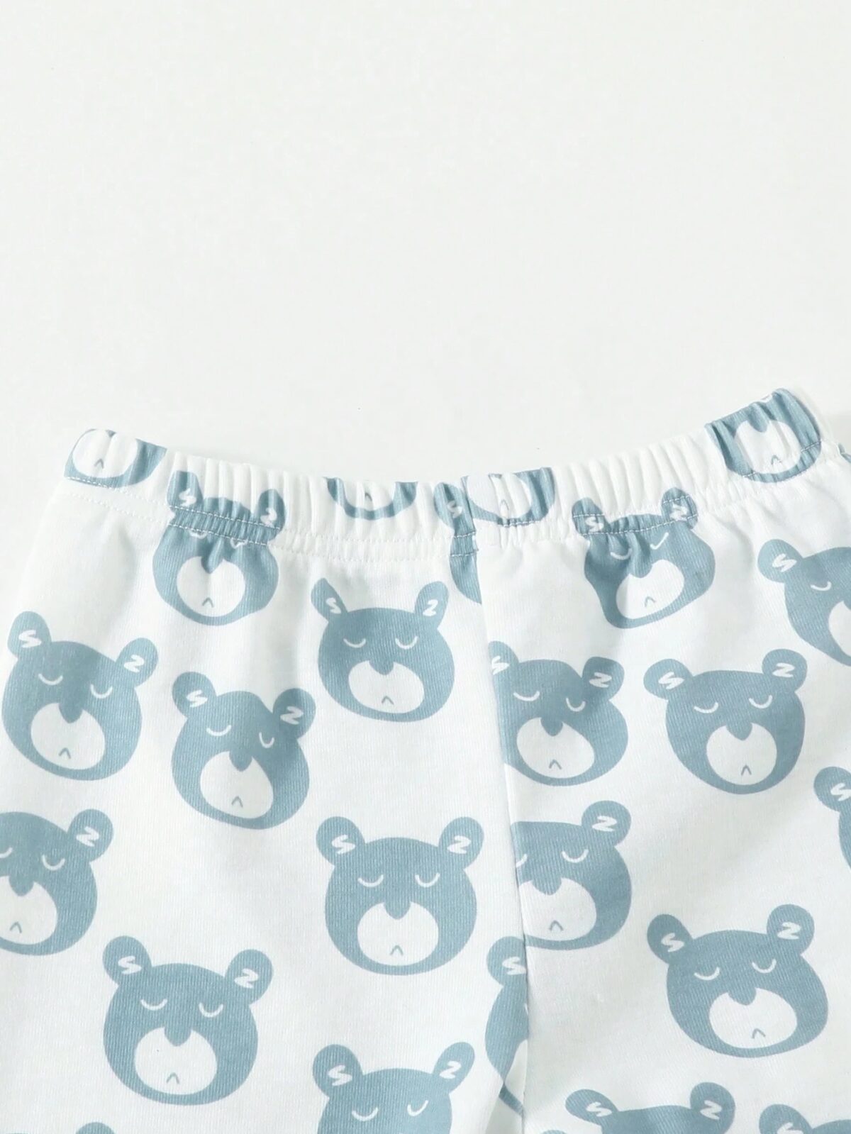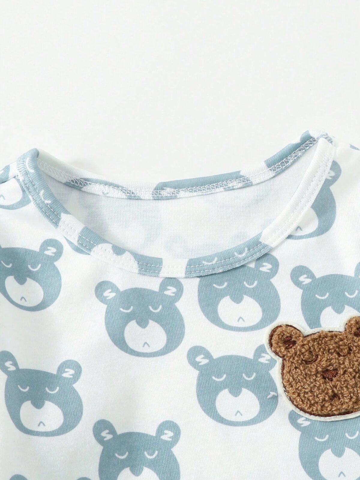 Dit is een aantrekkelijke jongens pyjamaset met een lichtblauw beer patroon op zowel het gezellige shirt met lange mouwen als de bijpassende broek, compleet met een schattige beer gezicht applicatie op de borst.