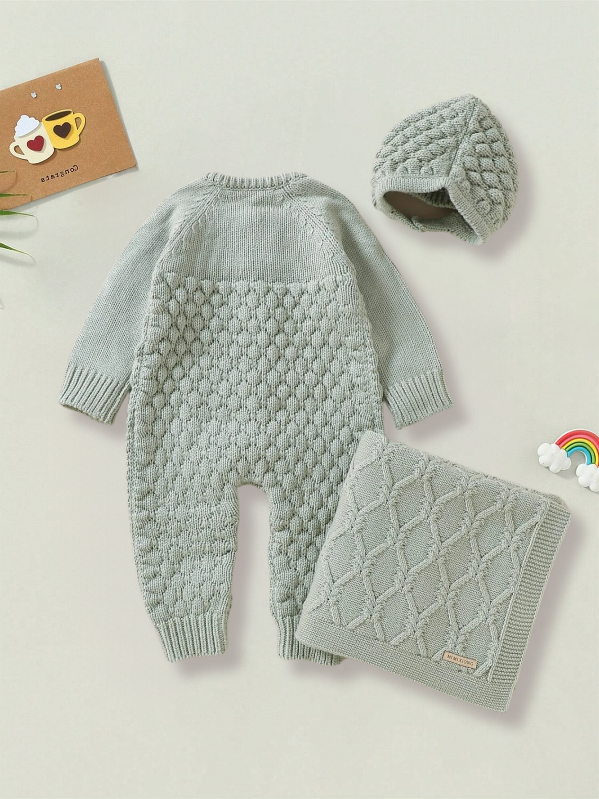 Gebreide jumpsuit met raglanmouwen, accessoiremuts en deken voor baby’s
