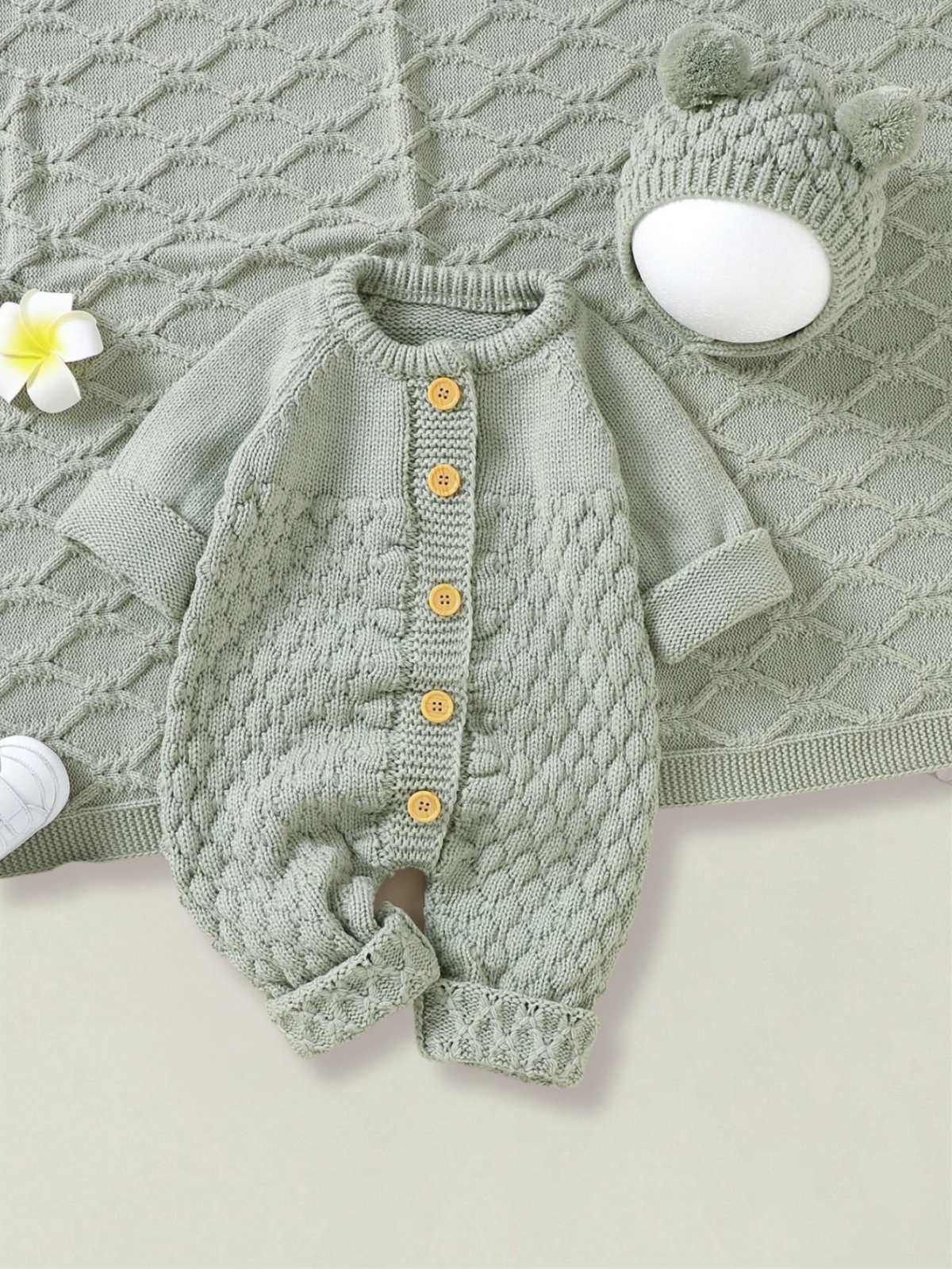 Knuffel je kleintje in deze pluchen, gebreide bodyset, compleet met een gezellig mutsje en dekentje – ideaal voor knuffelmomenten voor zowel babyjongens als meisjes.