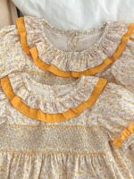 Deze prachtige romper met bloemen is een prachtige aanvulling op de garderobe van uw kleine meid en straalt een zoete en vintage-geïnspireerde charme uit. De romper heeft een delicate bloemenprint in zachte tinten, aangevuld met een kraag met ruches versierd met een contrasterende gele bies die een vleugje kleur en elegantie toevoegt. De pofmouwen en ruches op de mouwen versterken de schattige uitstraling.