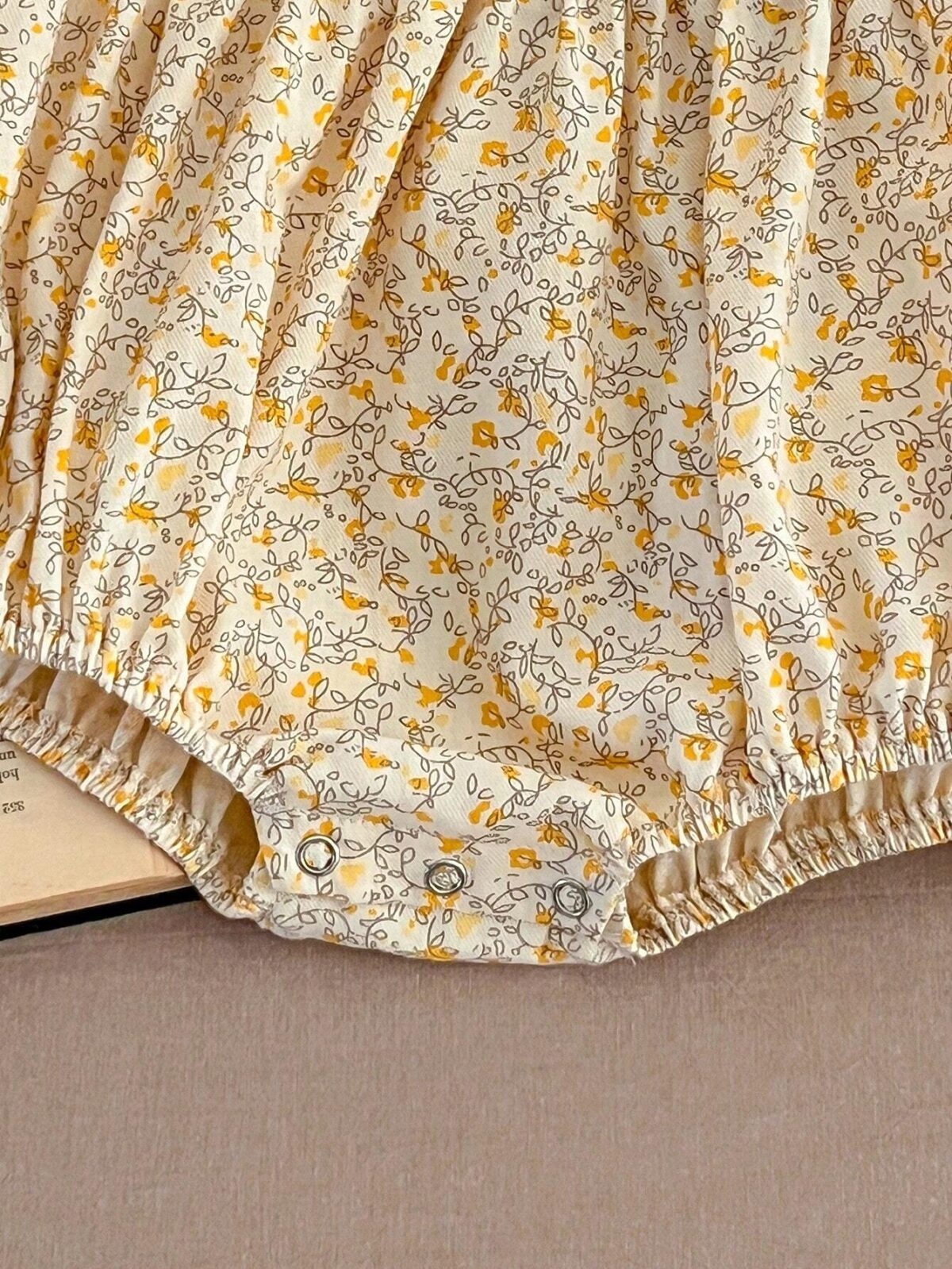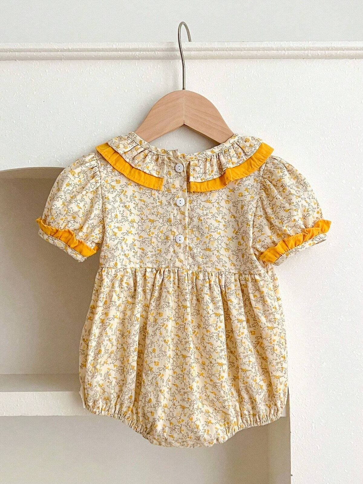 Deze prachtige romper met bloemen is een prachtige aanvulling op de garderobe van uw kleine meid en straalt een zoete en vintage-geïnspireerde charme uit. De romper heeft een delicate bloemenprint in zachte tinten, aangevuld met een kraag met ruches versierd met een contrasterende gele bies die een vleugje kleur en elegantie toevoegt. De pofmouwen en ruches op de mouwen versterken de schattige uitstraling.