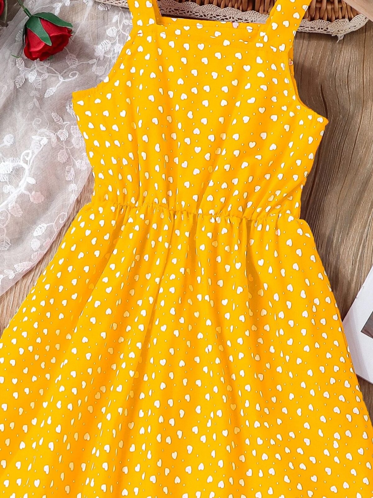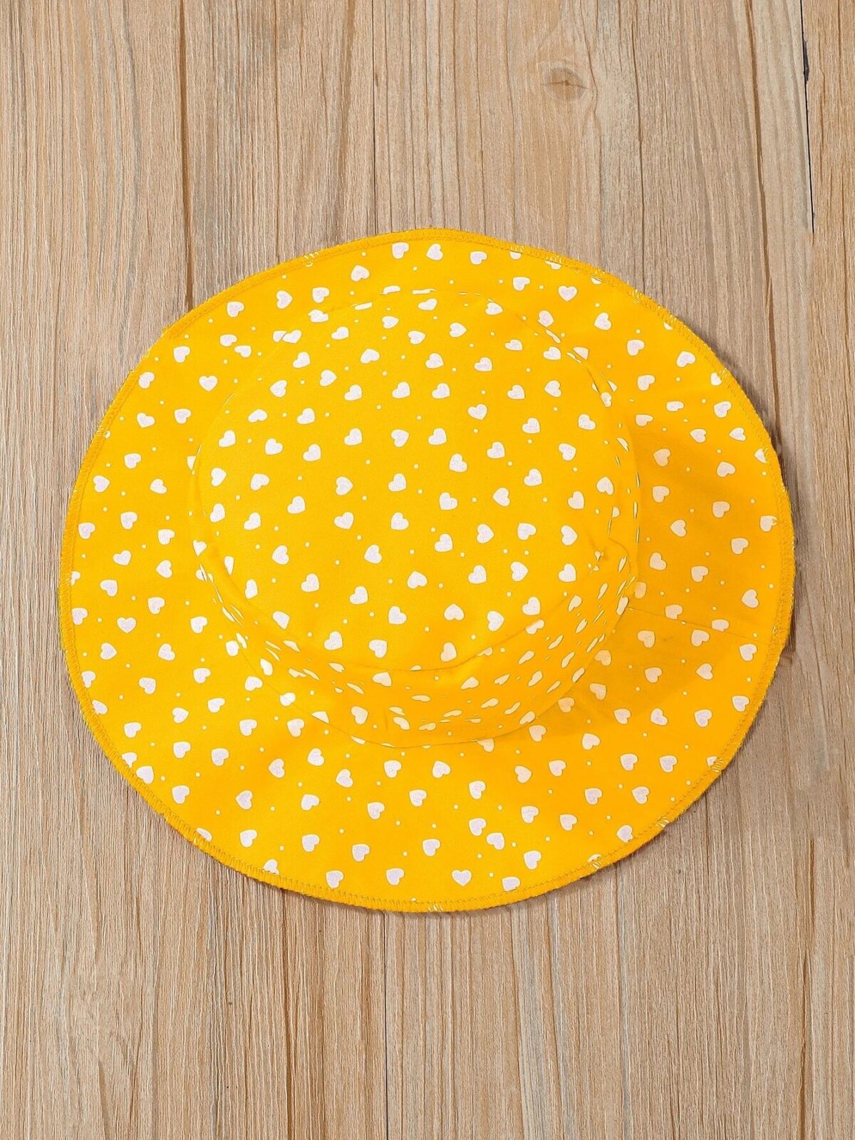 Gele cami-jurk met strik-schouderprint en hoed met hartprint