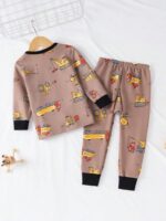 Deze speelse pyjamaset voor jongens is ontworpen met een reeks levendige bouwvoertuigen die tegen een zachte taupe achtergrond afsteken, waardoor een levendig bedtijdsemble ontstaat voor elke jonge bouwer. Het bovenblad is voorzien van een verscheidenheid aan felgekleurde kranen, dumptrucks en graafmachines, waardoor het een leuke keuze is voor kinderen die gefascineerd zijn door zware machines. De broek past bij het thema met een soortgelijke all-over print, wat zorgt voor een bijpassende en stijlvolle look. Deze set is gemaakt van een zachte en comfortabele stof met zachte voering bij de manchetten en is ideaal om warm te blijven tijdens koelere nachten. De elastische tailleband zorgt voor een goede pasvorm, perfect om thuis te slapen of te loungen. Deze pyjamaset maakt van bedtijd een spannend avontuur, klaar om dromen over grote bouwwerken en geweldige constructies te inspireren.