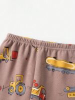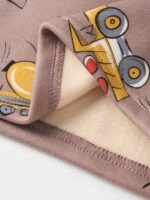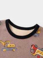 Avontuurlijke pyjama met bouwvoertuigthema in gedempt taupe voor jongens.