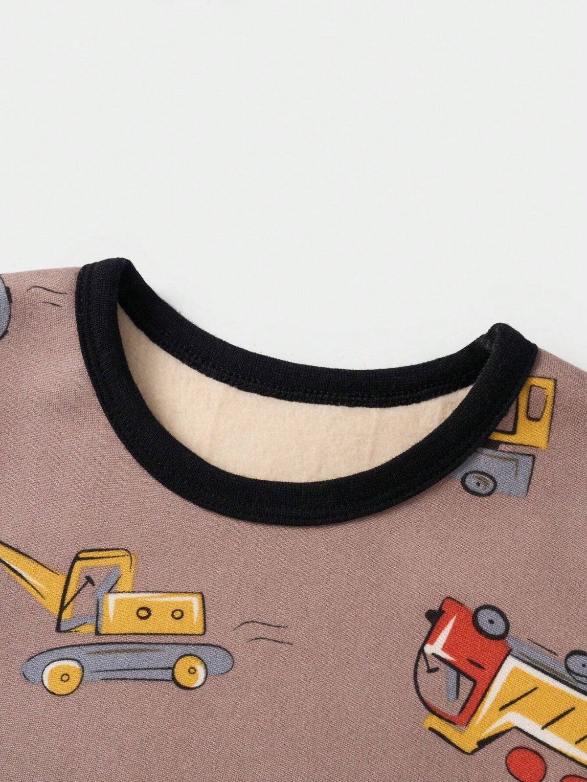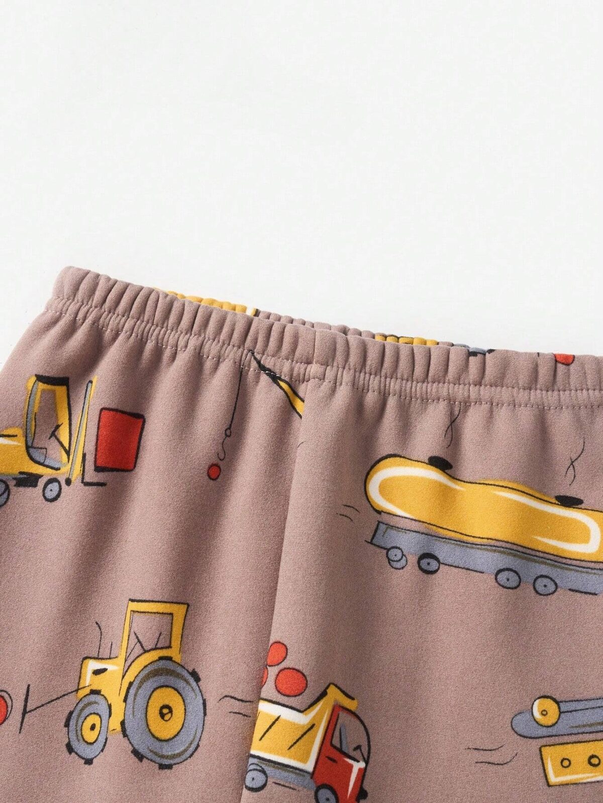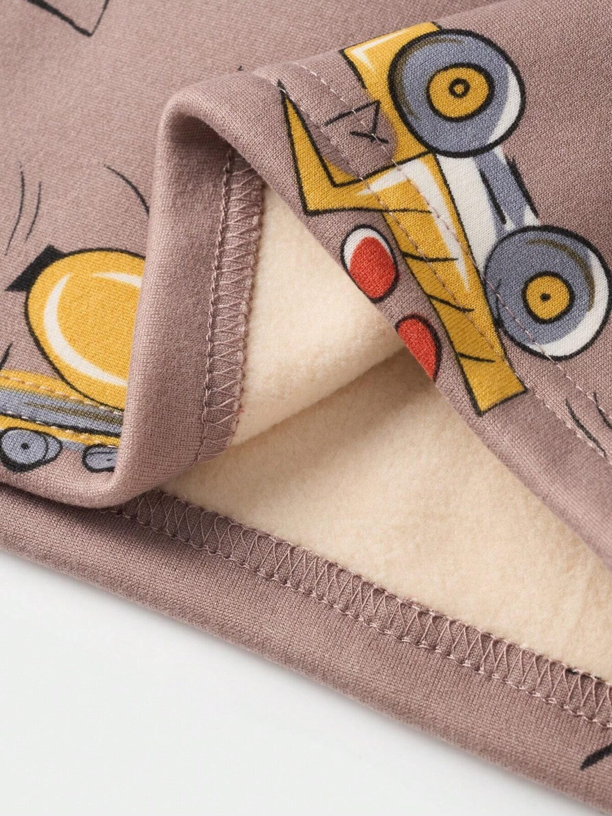 Deze speelse pyjamaset voor jongens is ontworpen met een reeks levendige bouwvoertuigen die tegen een zachte taupe achtergrond afsteken, waardoor een levendig bedtijdsemble ontstaat voor elke jonge bouwer. Het bovenblad is voorzien van een verscheidenheid aan felgekleurde kranen, dumptrucks en graafmachines, waardoor het een leuke keuze is voor kinderen die gefascineerd zijn door zware machines. De broek past bij het thema met een soortgelijke all-over print, wat zorgt voor een bijpassende en stijlvolle look. Deze set is gemaakt van een zachte en comfortabele stof met zachte voering bij de manchetten en is ideaal om warm te blijven tijdens koelere nachten. De elastische tailleband zorgt voor een goede pasvorm, perfect om thuis te slapen of te loungen. Deze pyjamaset maakt van bedtijd een spannend avontuur, klaar om dromen over grote bouwwerken en geweldige constructies te inspireren.
