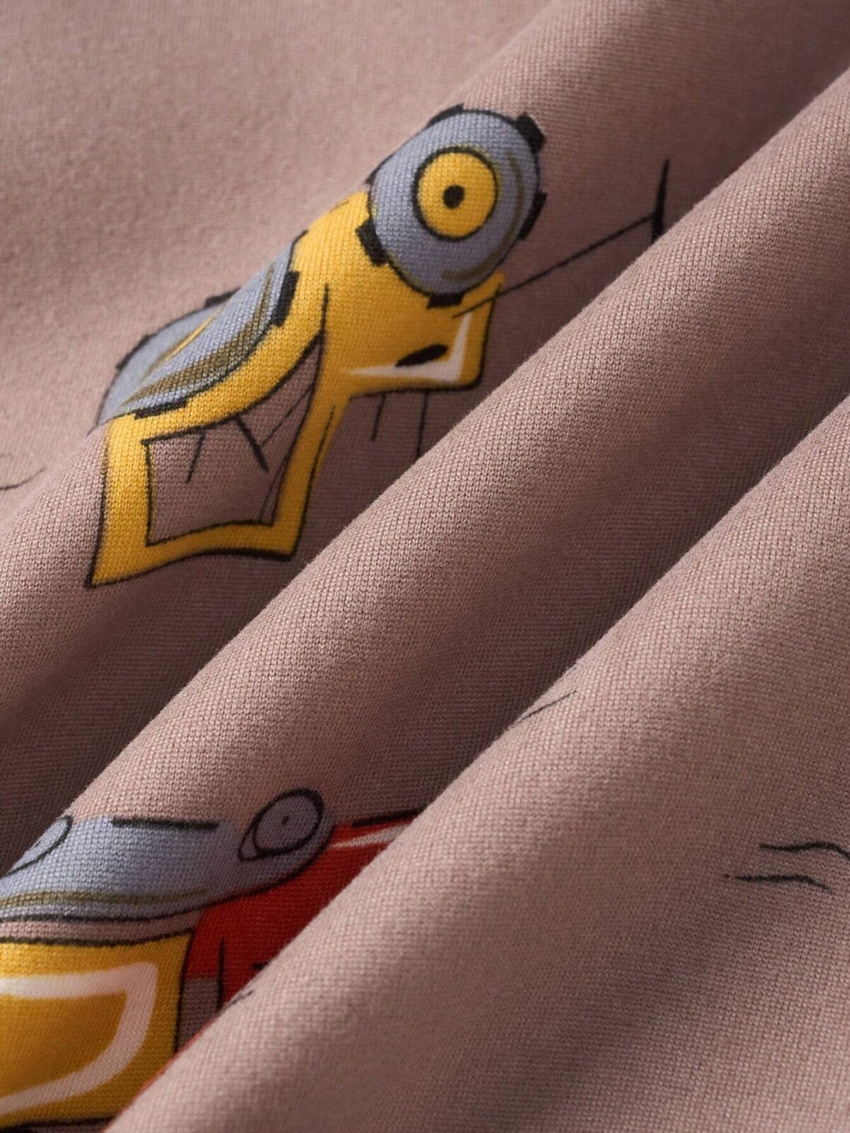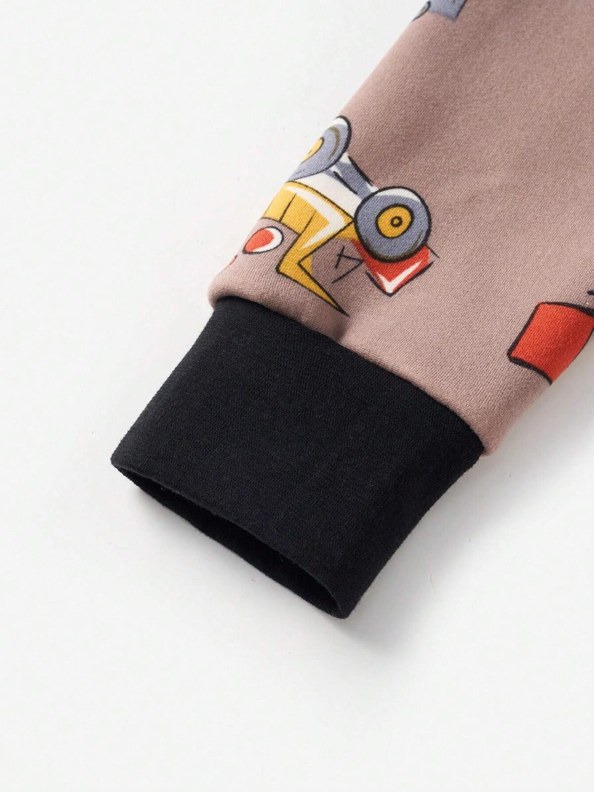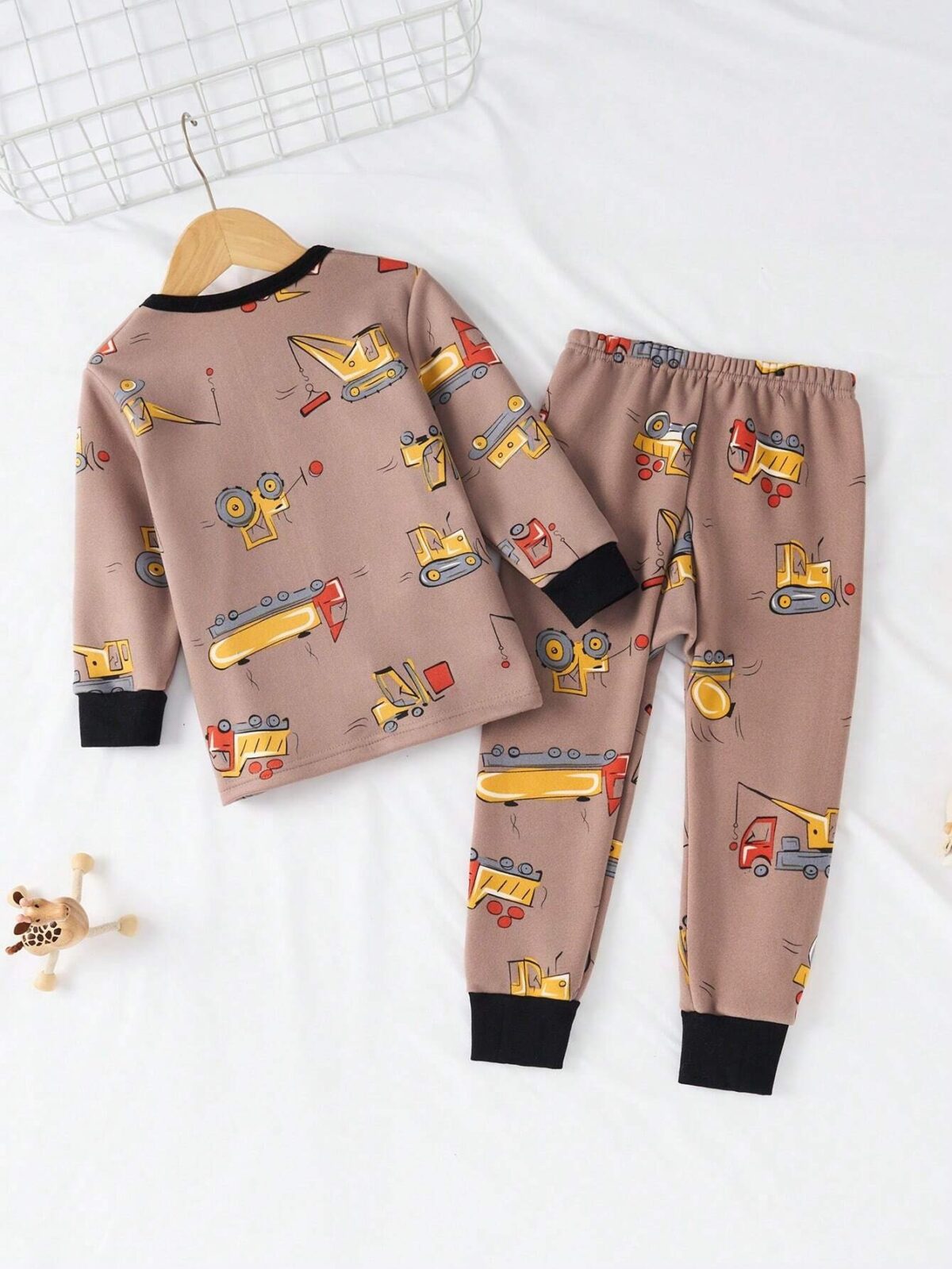 Deze speelse pyjamaset voor jongens is ontworpen met een reeks levendige bouwvoertuigen die tegen een zachte taupe achtergrond afsteken, waardoor een levendig bedtijdsemble ontstaat voor elke jonge bouwer. Het bovenblad is voorzien van een verscheidenheid aan felgekleurde kranen, dumptrucks en graafmachines, waardoor het een leuke keuze is voor kinderen die gefascineerd zijn door zware machines. De broek past bij het thema met een soortgelijke all-over print, wat zorgt voor een bijpassende en stijlvolle look. Deze set is gemaakt van een zachte en comfortabele stof met zachte voering bij de manchetten en is ideaal om warm te blijven tijdens koelere nachten. De elastische tailleband zorgt voor een goede pasvorm, perfect om thuis te slapen of te loungen. Deze pyjamaset maakt van bedtijd een spannend avontuur, klaar om dromen over grote bouwwerken en geweldige constructies te inspireren.