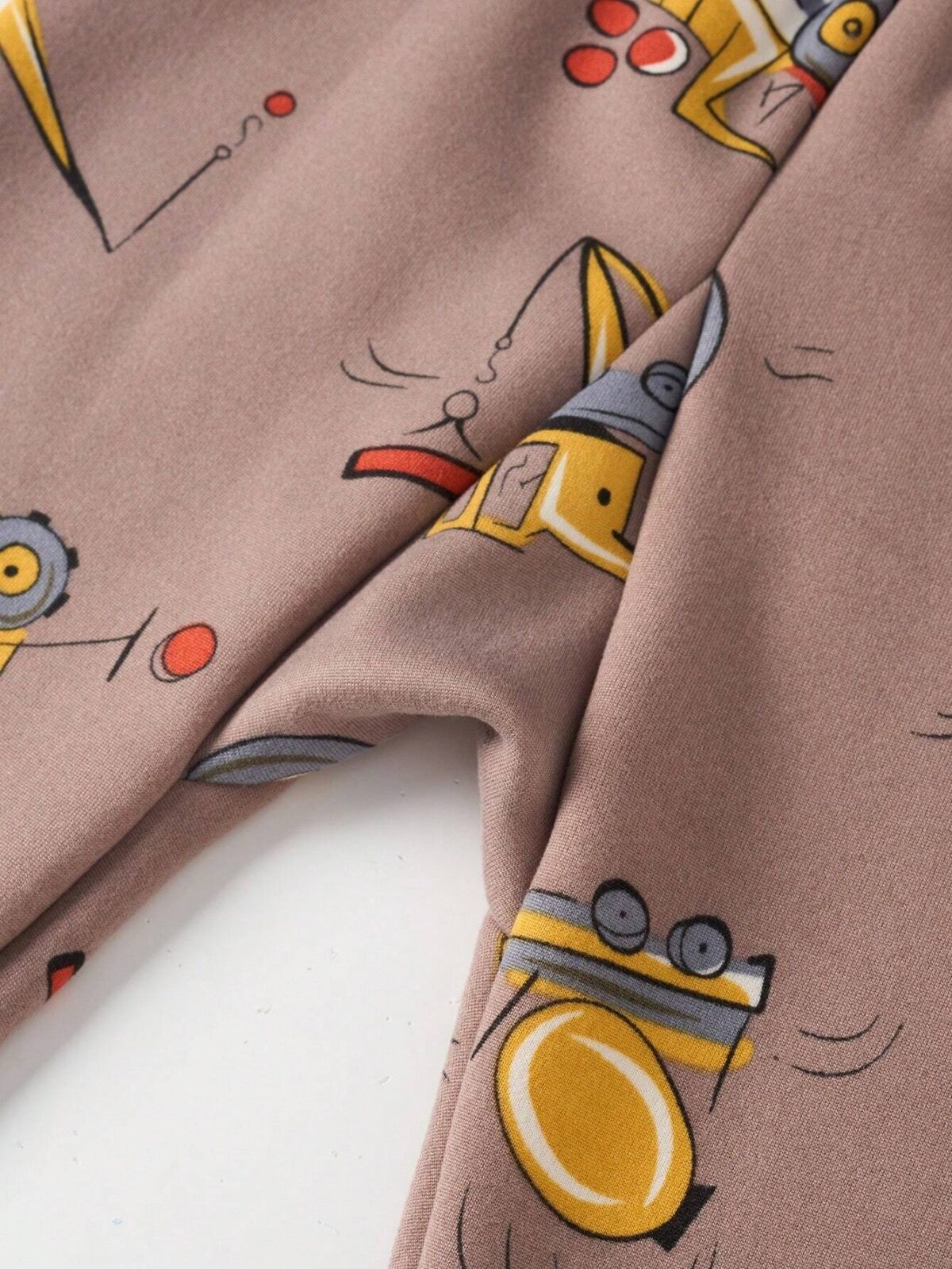 Avontuurlijke pyjama met bouwvoertuigthema in gedempt taupe voor jongens.