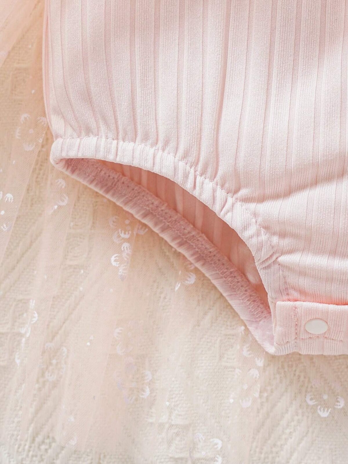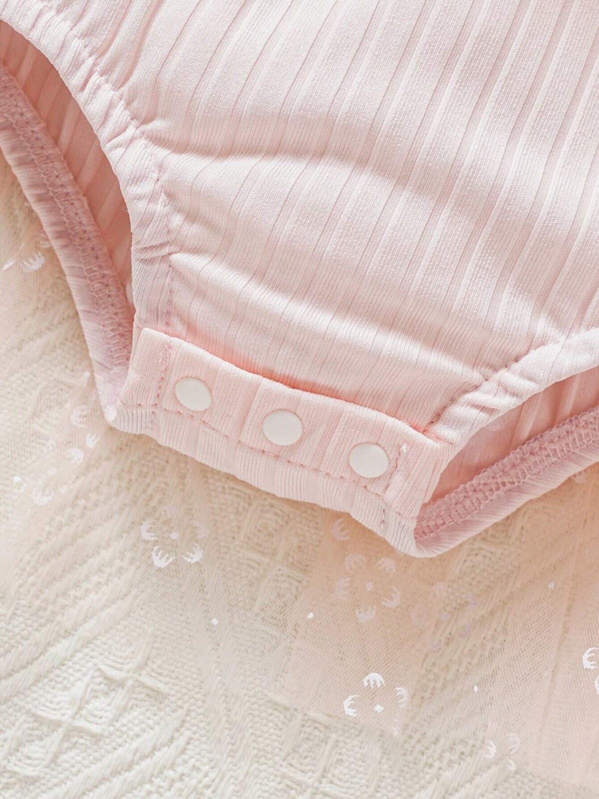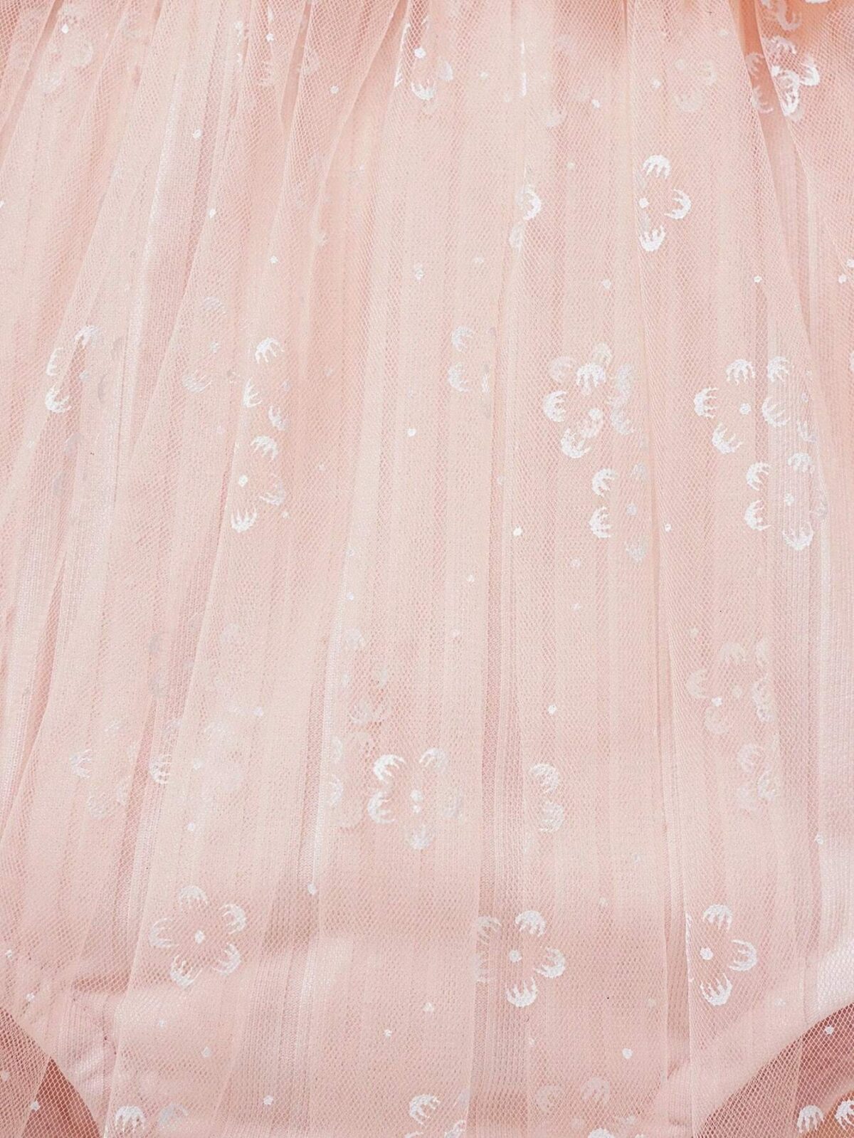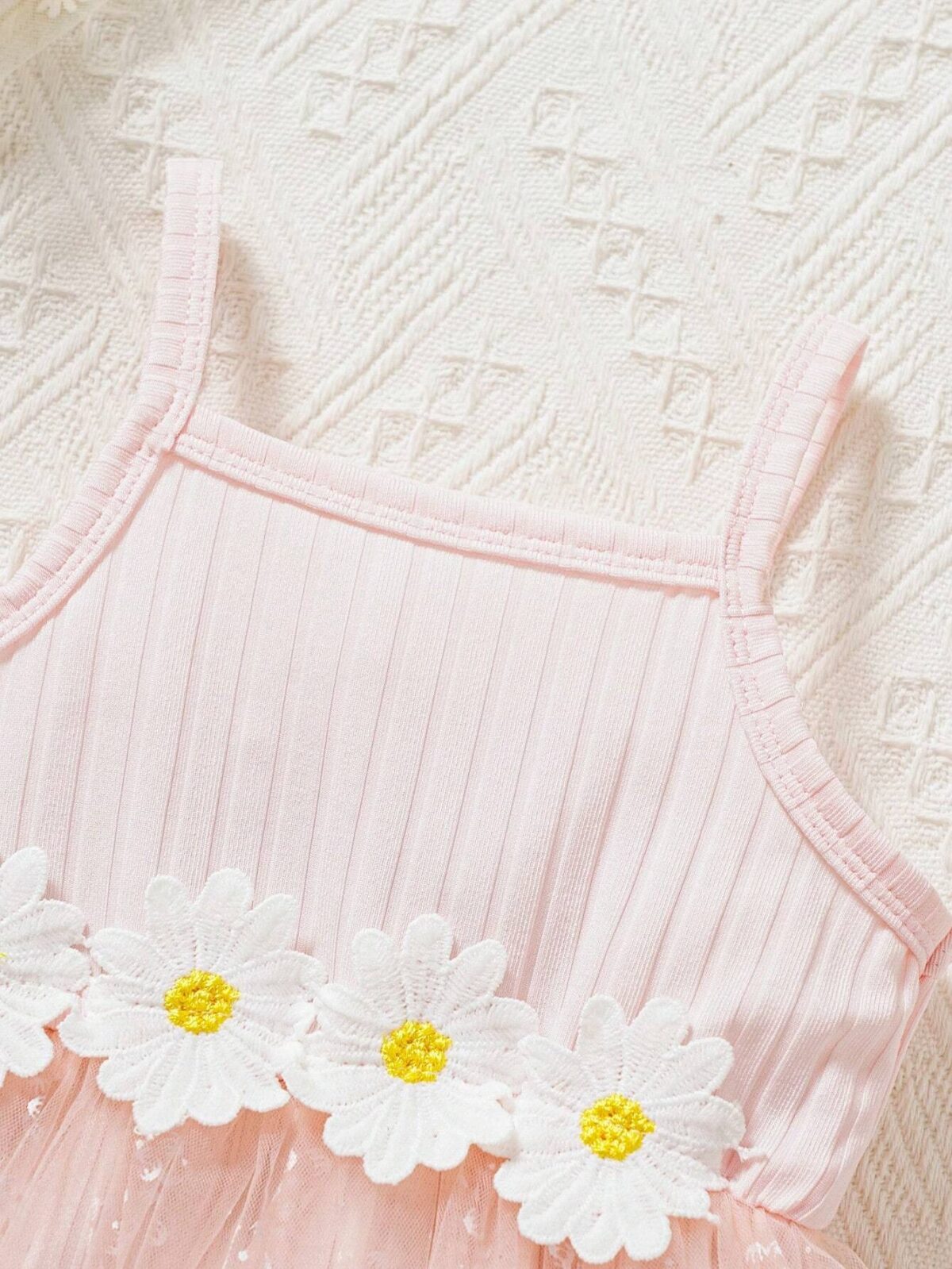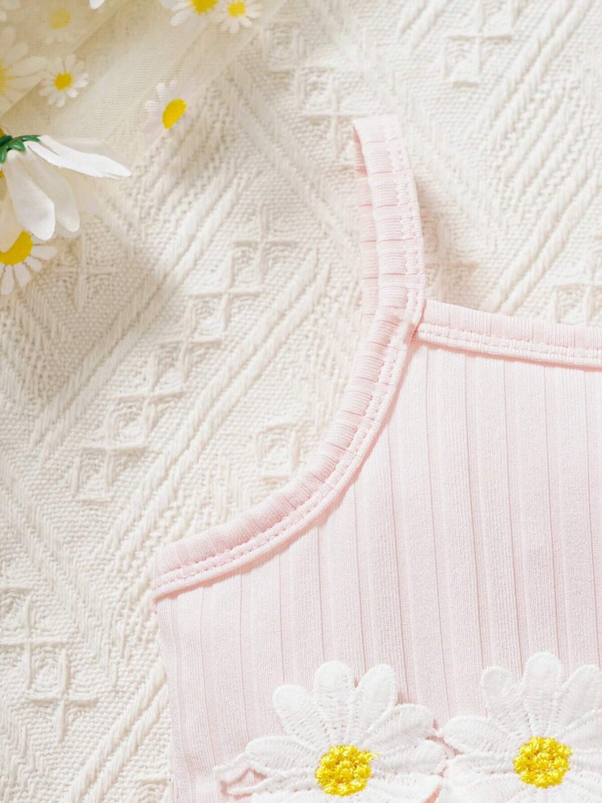 Versier je kleintje in deze lieflijke roze romper, met een tailleband met madeliefjesbloemen en een sprankelende rok van tule, perfect voor elke speciale gelegenheid.