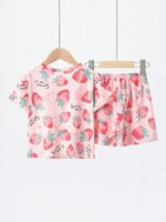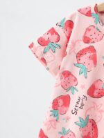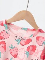 Deze heerlijke pyjamaset heeft een frisse en vrolijke aardbeienprint tegen een zachtroze achtergrond, perfect om een vleugje kleur toe te voegen aan het slapengaan. De set bestaat uit een top met korte mouwen en een bijpassende short, beide versierd met aardbeien in verschillende maten en speelse tekstelementen die een speelse touch toevoegen. De stof is licht en ademend, waardoor hij ideaal is voor warme nachten of om lekker in huis te ontspannen. Deze set biedt niet alleen comfort, maar voegt ook een leuk, fruitig thema toe aan de nachtkledingcollectie van een kind, waardoor naar bed gaan een aangenamere ervaring wordt.