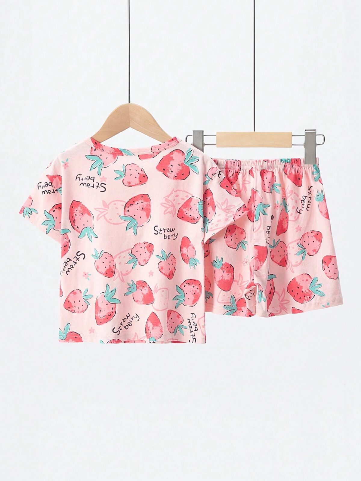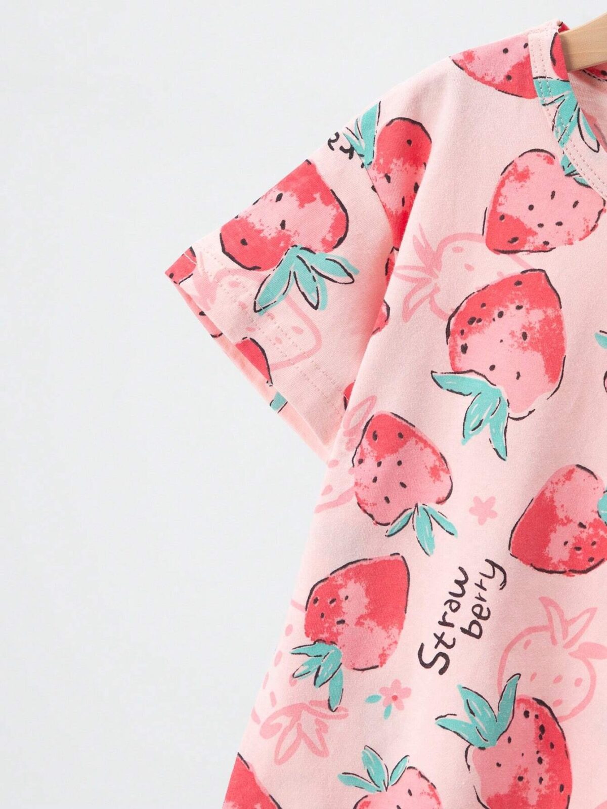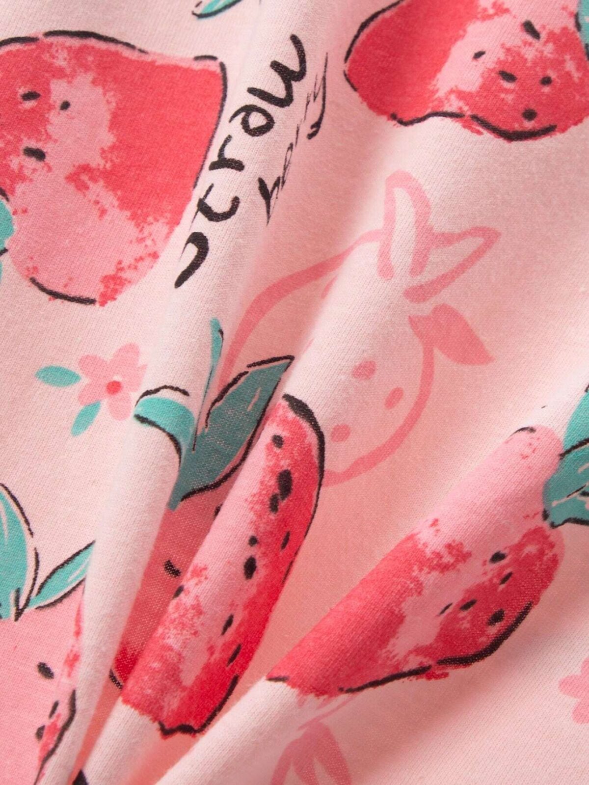 Deze heerlijke pyjamaset heeft een frisse en vrolijke aardbeienprint tegen een zachtroze achtergrond, perfect om een vleugje kleur toe te voegen aan het slapengaan. De set bestaat uit een top met korte mouwen en een bijpassende short, beide versierd met aardbeien in verschillende maten en speelse tekstelementen die een speelse touch toevoegen. De stof is licht en ademend, waardoor hij ideaal is voor warme nachten of om lekker in huis te ontspannen. Deze set biedt niet alleen comfort, maar voegt ook een leuk, fruitig thema toe aan de nachtkledingcollectie van een kind, waardoor naar bed gaan een aangenamere ervaring wordt.