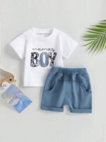 Introduceer je kleine jongen aan de wereld van comfort en stijl met onze Katoenen Set met Korte Mouwen T-shirt en Shorts. Deze heerlijke set bestaat uit een charmant wit T-shirt met de speelse tekst “Mama’s Boy” in gedurfde, leuke letters, wat de zoetheid van je kleintje benadrukt. De bijpassende blauwe shorts zijn ontworpen met een zachte elastische tailleband en handige zijzakken, waardoor ze perfect zijn voor de hele dag draagplezier en spel.