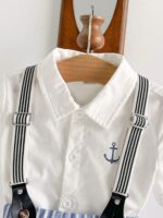Dress your little sailor in this charming Anchor Pattern Short Sleeve Shirt and Blue and White Striped Overalls Set, perfect for a nautical-themed look. The crisp white shirt features a delicate anchor embroidery on the chest, adding a touch of maritime charm. With its classic collar and button-down front, this shirt exudes timeless elegance while ensuring your child stays comfortable and stylish.