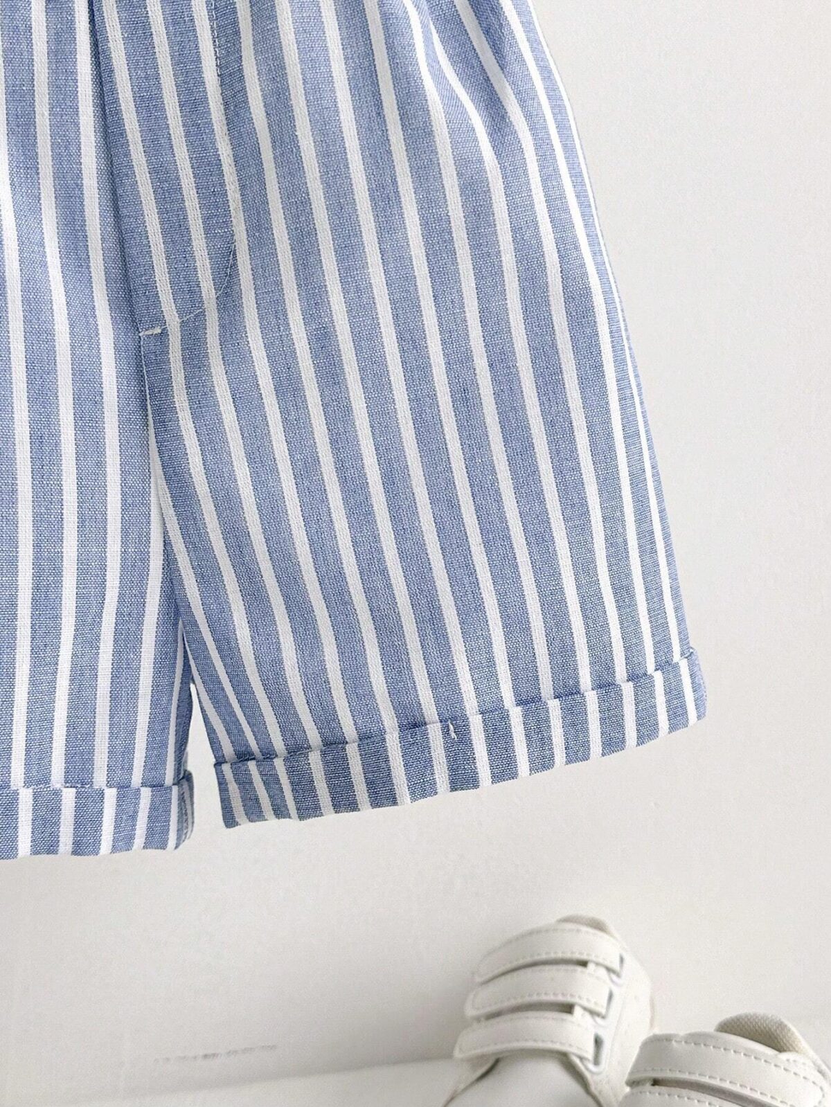 The matching overalls boast a playful blue and white stripe pattern, creating a fresh and breezy vibe. Adjustable straps and sturdy buttons ensure a secure fit, while the soft fabric allows for all-day comfort and easy movement. The overalls are designed with practicality in mind, featuring convenient pockets and a comfortable elastic waistband.