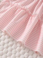 Crafted from soft and breathable fabric, it ensures comfort while maintaining style. The gently gathered waistline and tiered skirt provide a flattering and playful silhouette, perfect for twirling and dancing. Whether it’s a family gathering, a birthday party, or a casual day out, this pink striped dress with its asymmetrical collar and bow decoration is sure to make your child look adorable and feel special.