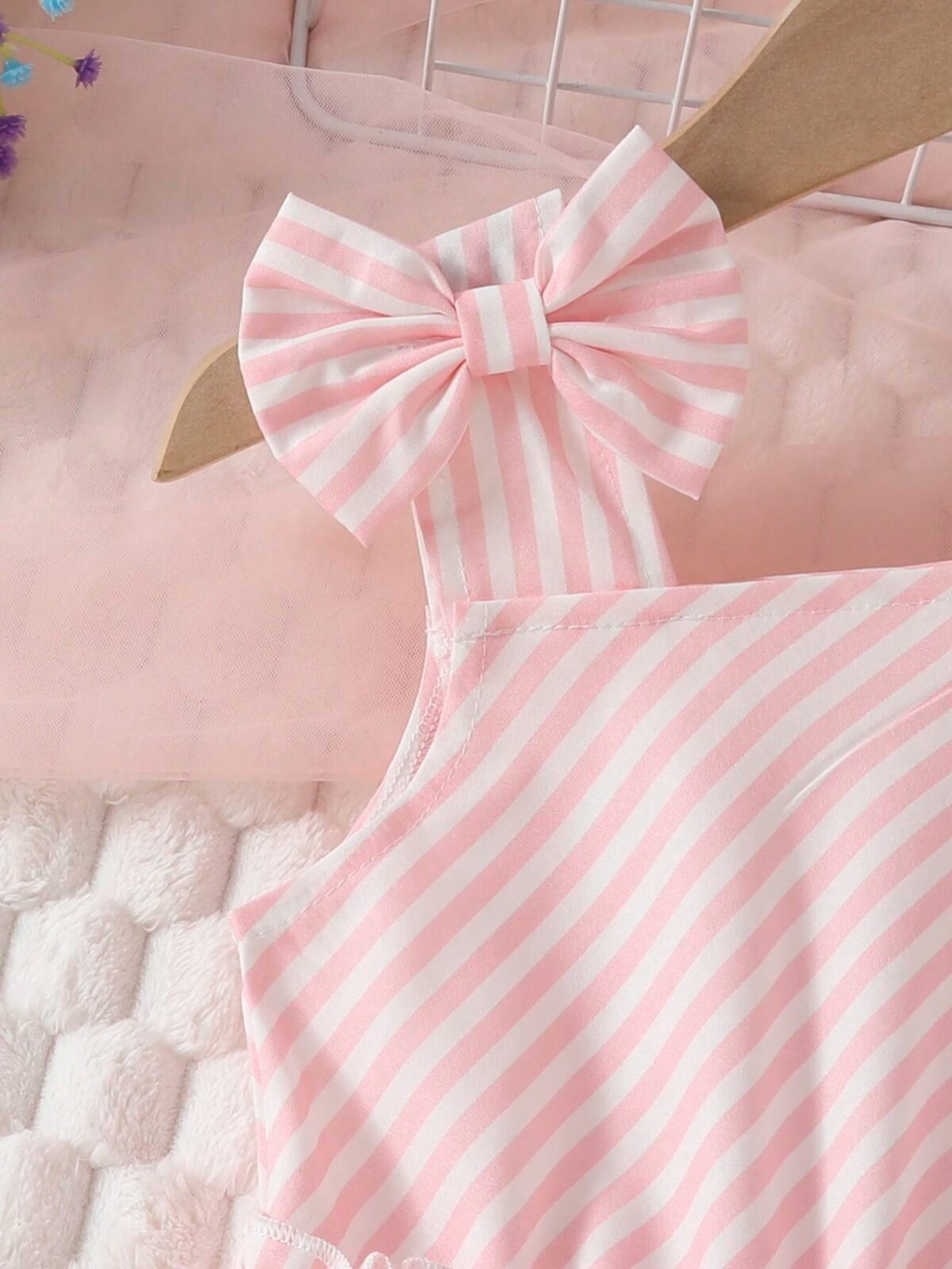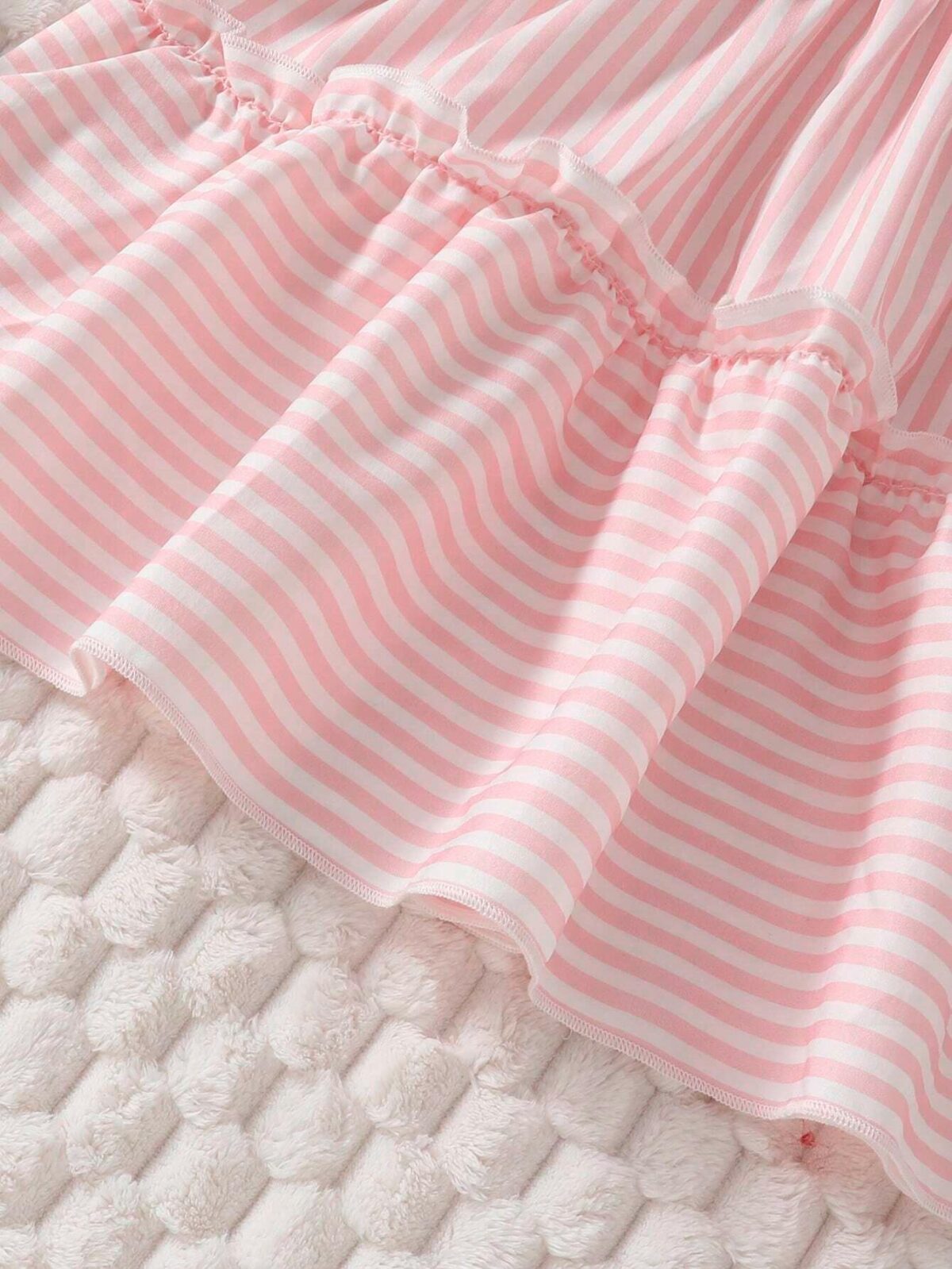 Charming pink striped dress featuring an asymmetrical collar and a cute bow decoration, perfect for adding a touch of elegance to any occasion.