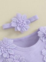 Adorable lavender bodysuit with floral appliqués and a delicate tulle skirt, complete with a matching headband for a charming look.