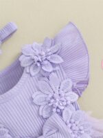 This enchanting lavender bodysuit for baby girls features beautiful floral appliqués and a delicate tulle skirt, creating an elegant and whimsical look. The ribbed bodice is designed with flutter sleeves and is adorned with intricate flower details and a cute bow, adding a touch of sophistication. The tulle skirt is embellished with delicate lace patterns, making it perfect for special occasions. The bodysuit comes with a matching headband featuring a coordinating floral design, completing the adorable ensemble. Made from soft, breathable fabric, this outfit ensures comfort and style for your little one, making it a perfect addition to her wardrobe.