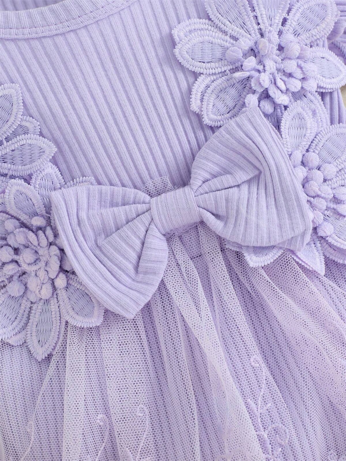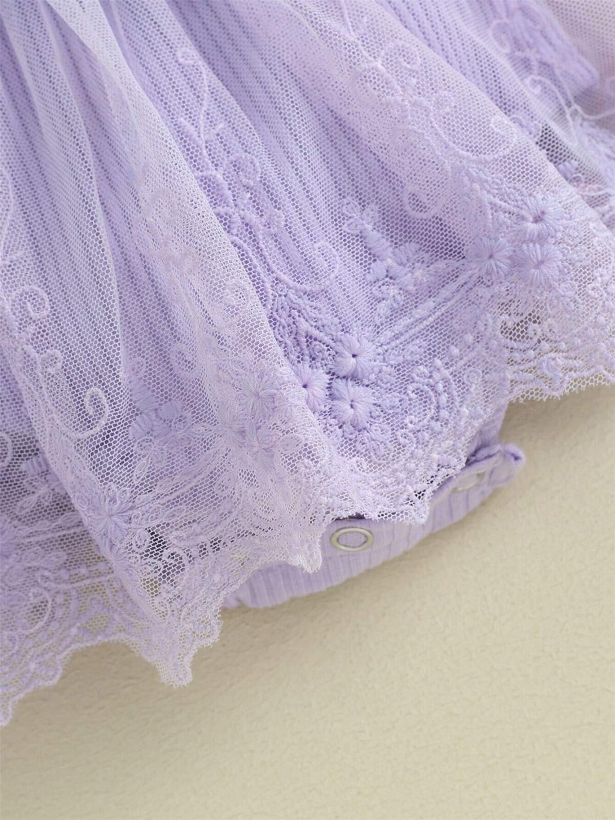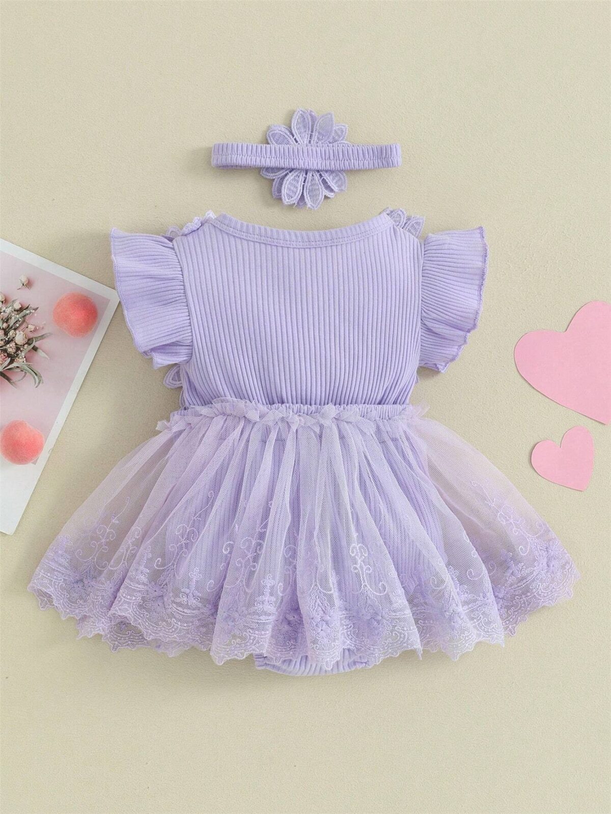 This enchanting lavender bodysuit for baby girls features beautiful floral appliqués and a delicate tulle skirt, creating an elegant and whimsical look. The ribbed bodice is designed with flutter sleeves and is adorned with intricate flower details and a cute bow, adding a touch of sophistication. The tulle skirt is embellished with delicate lace patterns, making it perfect for special occasions. The bodysuit comes with a matching headband featuring a coordinating floral design, completing the adorable ensemble. Made from soft, breathable fabric, this outfit ensures comfort and style for your little one, making it a perfect addition to her wardrobe.