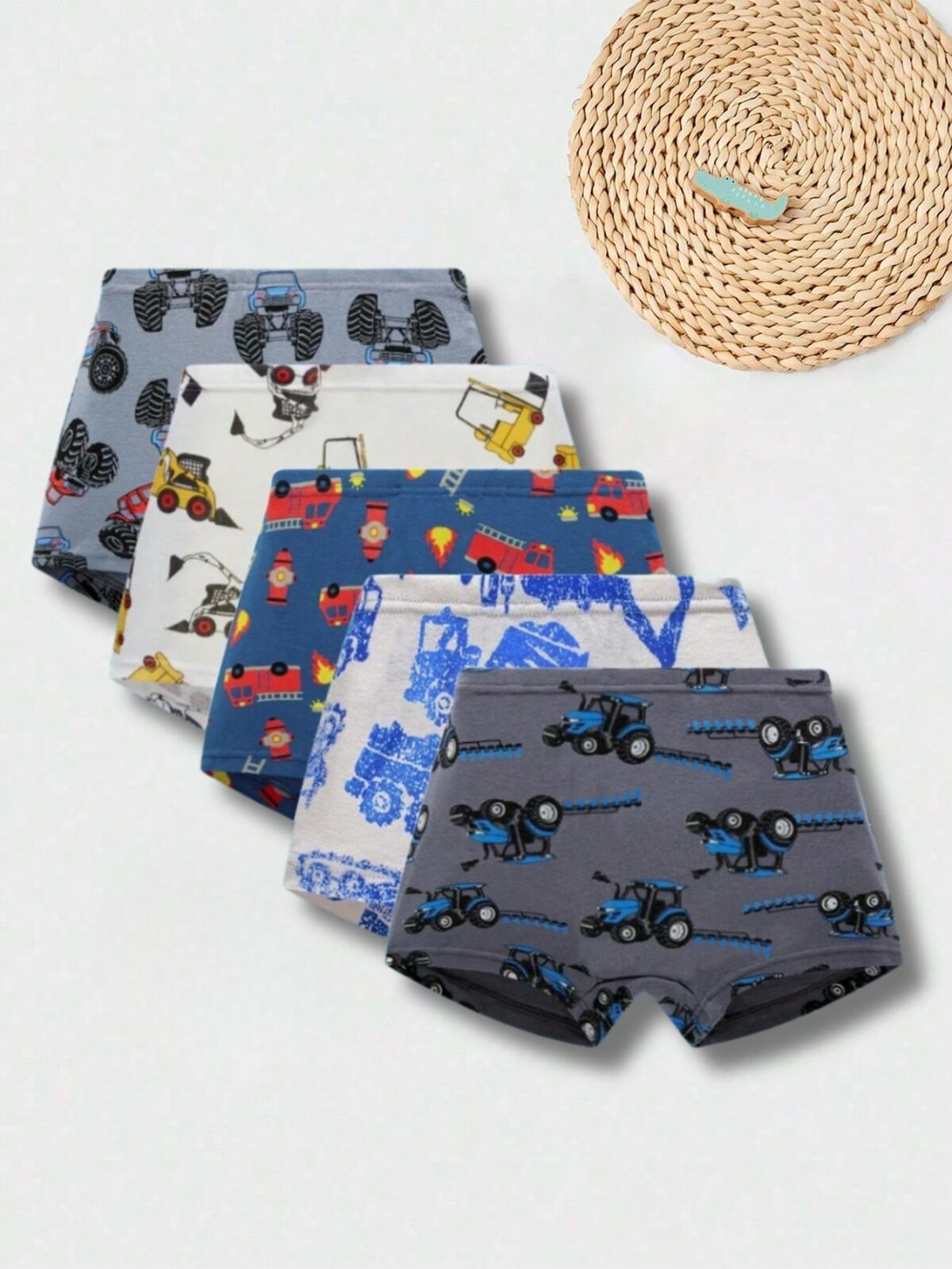 Dynamic set of toddler boy’s boxer briefs with exciting vehicle and machinery prints