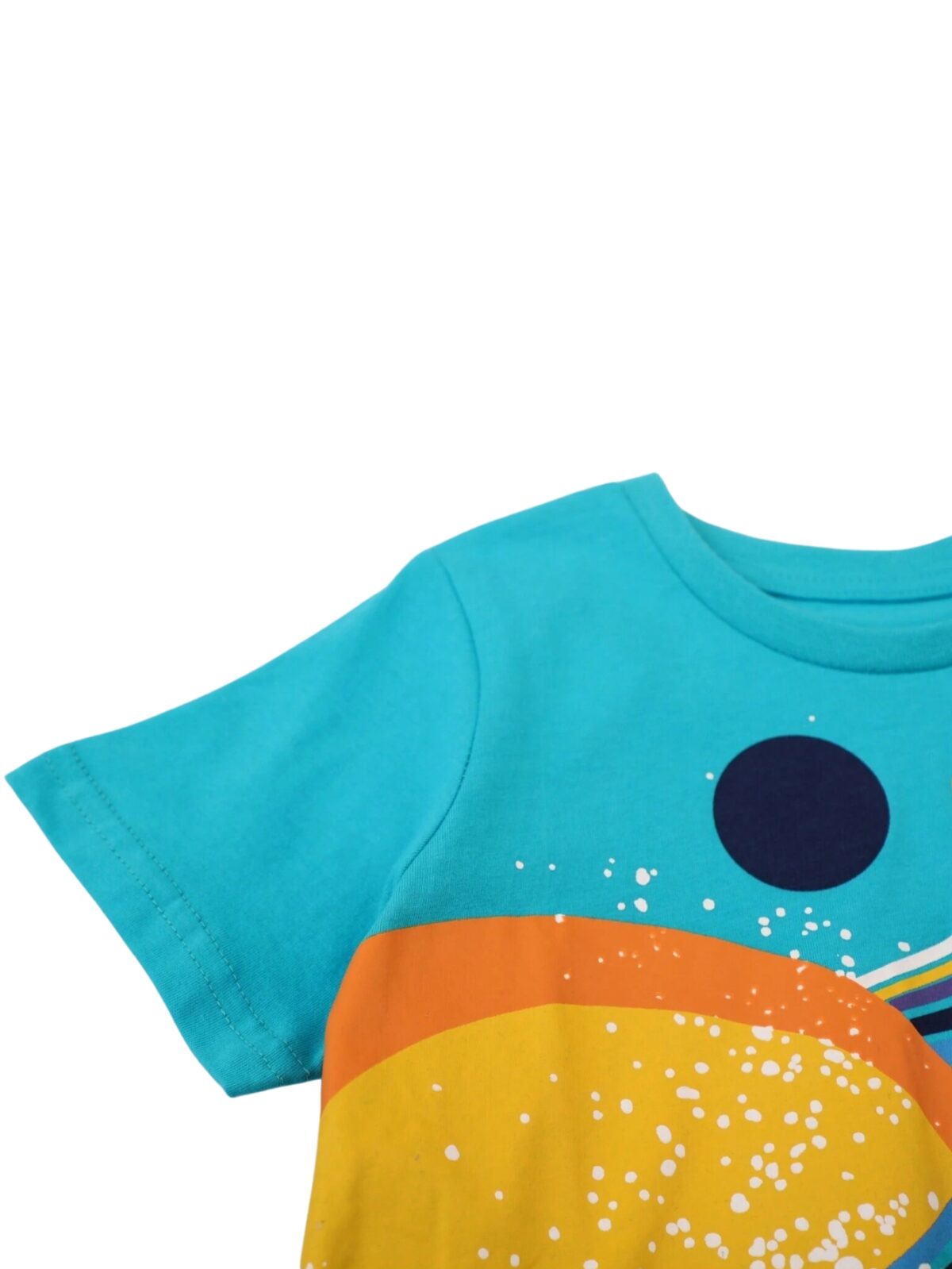 A vibrant toddler boy’s cosmic T-shirt in turquoise, featuring colorful space-themed graphics with planets, a rocket, and an astronaut.