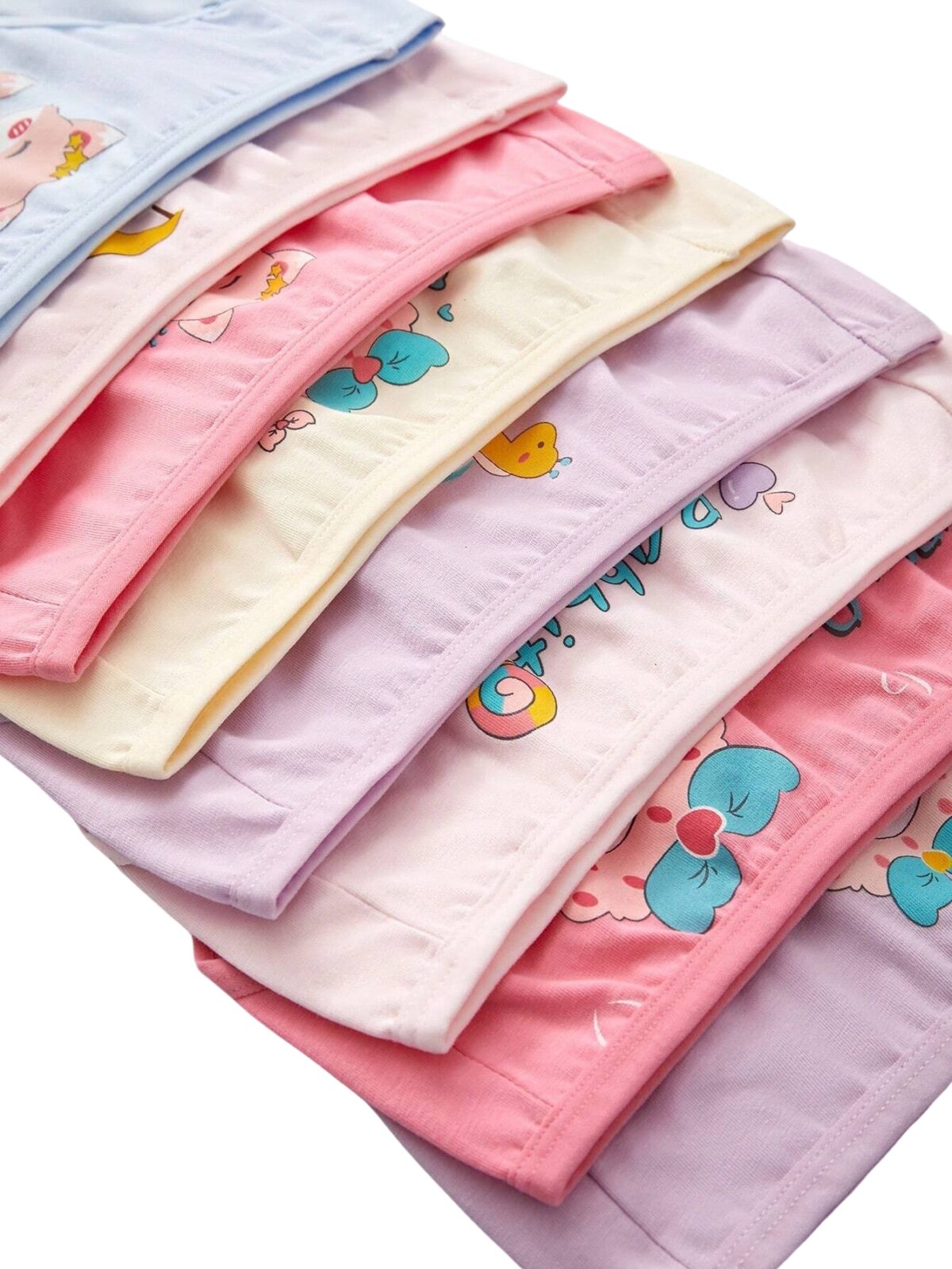 Dive into a magical world with this enchanting set of seven toddler girl’s underpants, each pair blooming with pastel shades and endearing designs. The collection features a menagerie of cute creatures, including a dignified cat, a playful kitten on a moon, a cheerful cow, and a cuddly bear, all designed to spark joy. Each underpant is a canvas of soft color – sky blue, candy pink, lemon cream, lilac, and more, accentuated with fun motifs like stars, rainbows, and hearts. ‘Happy Day’ and ‘Rabbit’ messages add a whimsical touch. These underpants are made with a gentle, stretchable fabric and equipped with a comfortable elastic waistband, ensuring a cozy fit for all-day play. The variety of prints in this set promises a fresh and fun start to each day, perfect for the imaginative spirit of a young child.