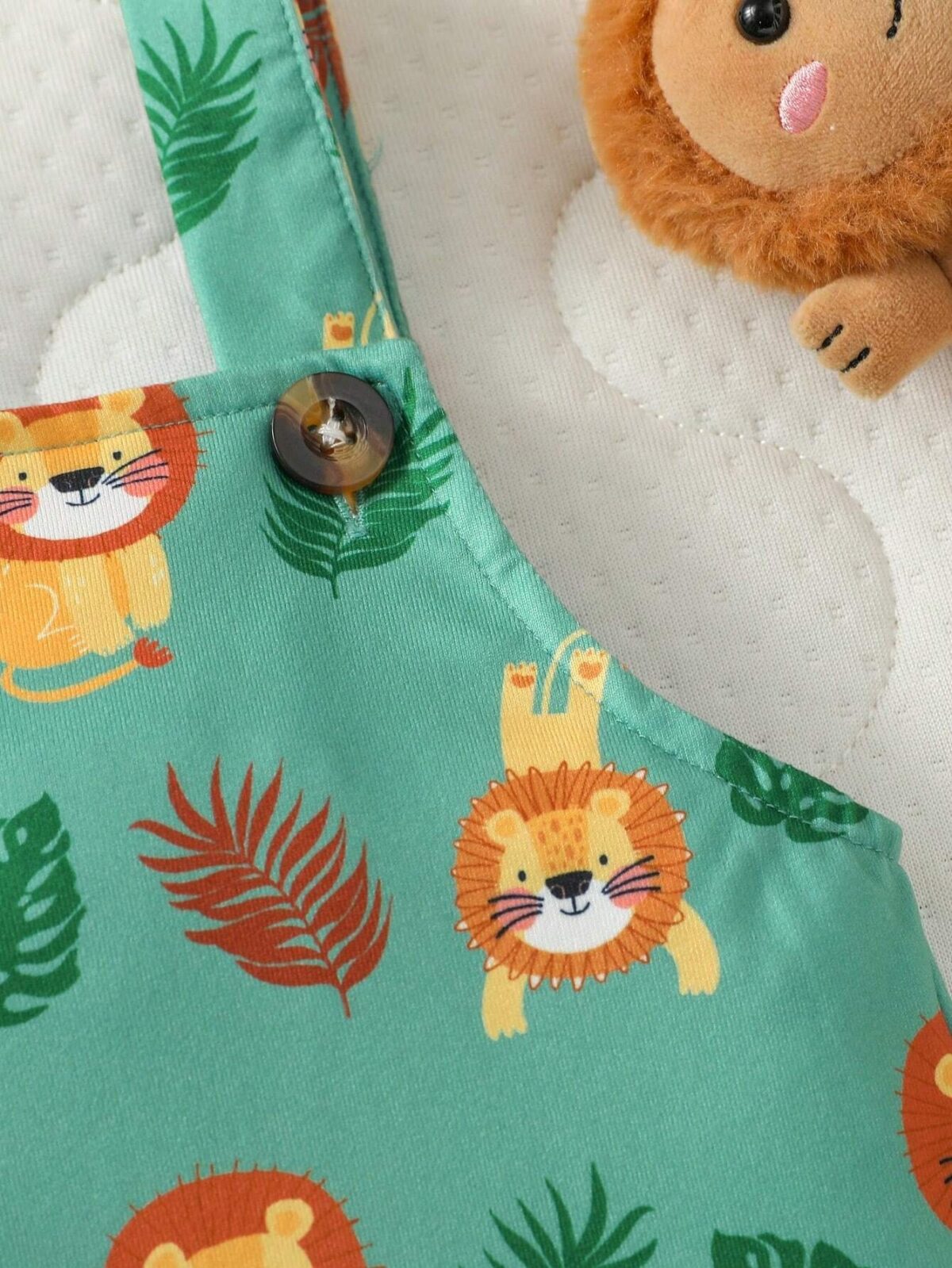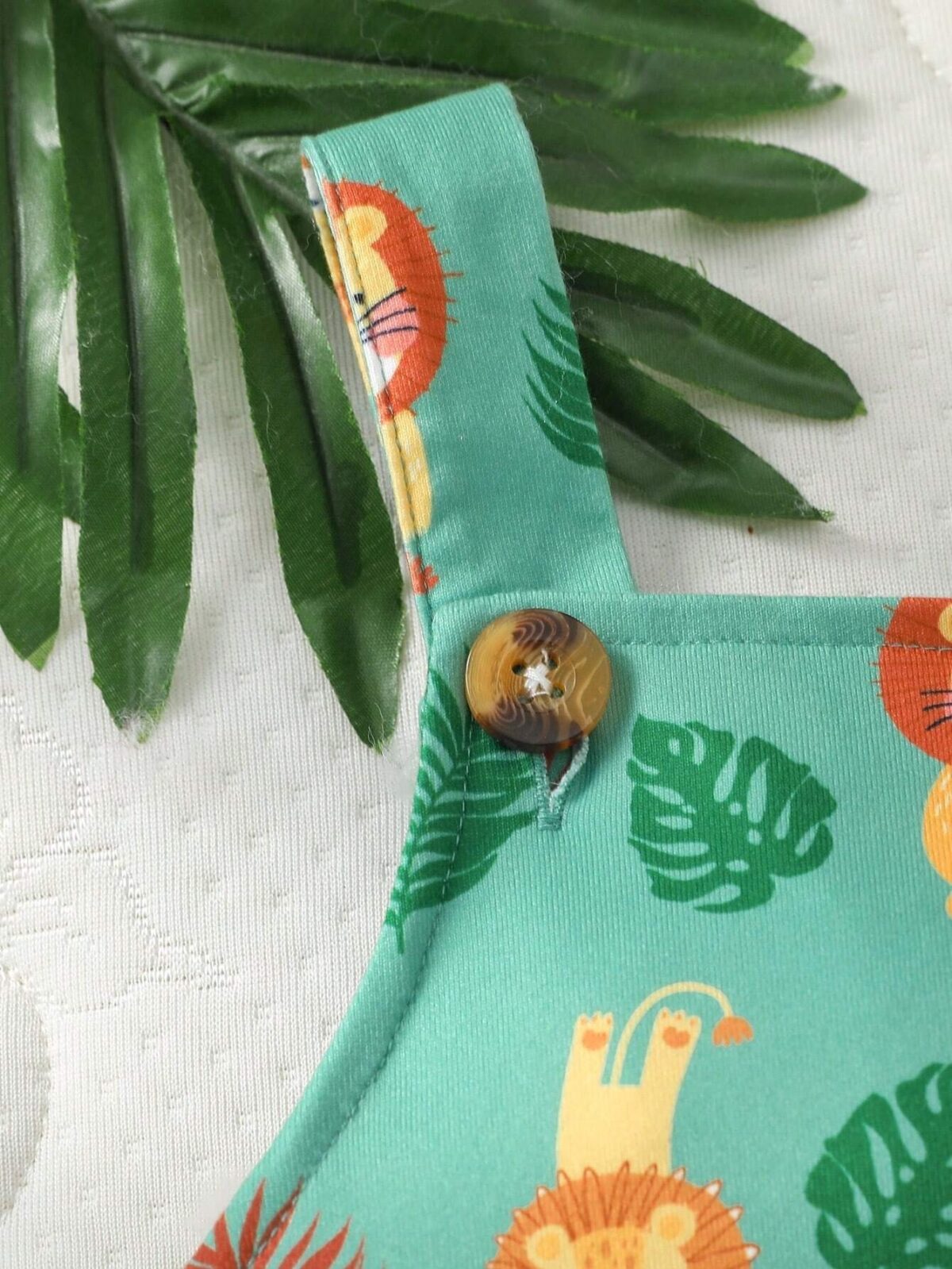 This charming jumpsuit is a delightful addition to your baby’s wardrobe, featuring an adorable cartoon animal print that brings a playful and fun element to their outfit. The jumpsuit showcases vibrant illustrations of cheerful lions and tropical leaves, creating a whimsical design that your little one will love. Made from soft, breathable fabric, it ensures your baby stays comfortable throughout the day. The adjustable straps with button closures provide a secure and customizable fit, while the snap closures at the bottom make diaper changes quick and easy. Ideal for casual outings, playdates, or cozy days at home, this animal-themed jumpsuit combines practicality with cute style, making it a must-have for your little one’s collection.