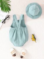 This delightful bodysuit features a charming dinosaur embroidery on the front, adding a touch of whimsy to your baby’s wardrobe. The soft, breathable fabric ensures all-day comfort, while the matching hat provides extra sun protection, making it ideal for outdoor adventures. The bodysuit comes with adjustable shoulder straps and a convenient front pocket, offering both style and functionality. The snap closures at the bottom make diaper changes quick and easy. Perfect for playdates, outings, or casual days at home, this dinosaur-themed bodysuit with hat is a versatile and stylish choice for your little one.
