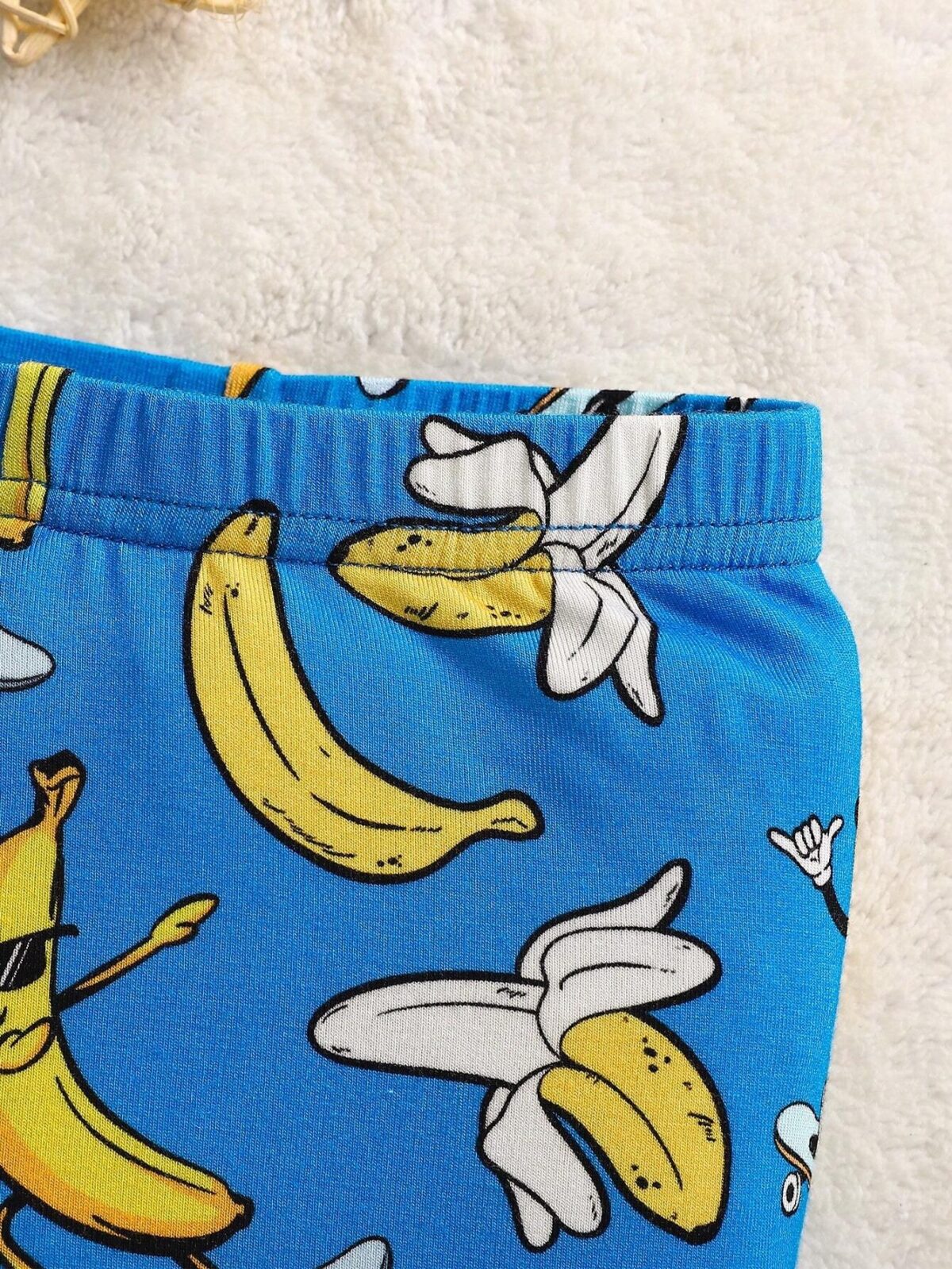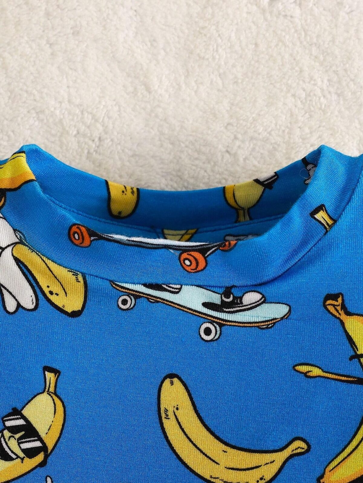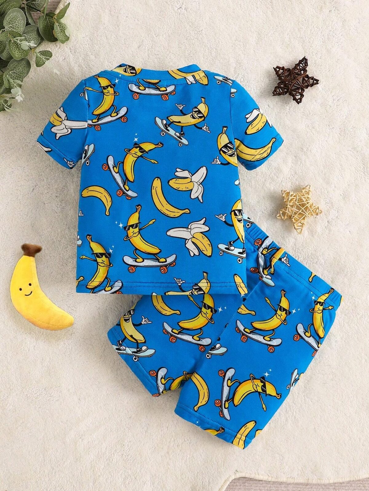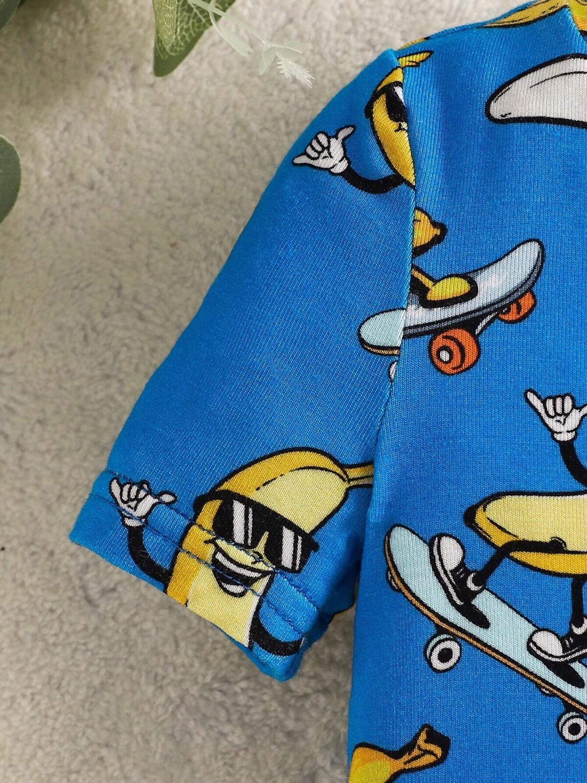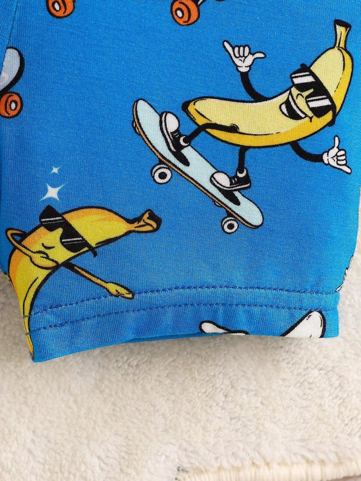 Get ready for a burst of fun with this delightful fruit pattern short sleeve and shorts set. This vibrant ensemble features cheerful banana characters skateboarding and having a blast, all set against a bright blue background. The short sleeve top and matching shorts are made from soft, breathable fabric, ensuring your child stays comfortable and cool throughout the day. Perfect for playful adventures and cozy lounging, this set brings a touch of whimsy and joy to your child’s wardrobe. With its eye-catching design and comfortable fit, it’s sure to become a favorite for both you and your little one. Ideal for sunny days, playdates, or simply adding a splash of fun to everyday wear, this fruit pattern set is a must-have for your child’s closet.