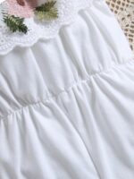 This lovely baby girl bodysuit features a pristine white color, complemented by delicate floral embroidery across the ruffled neckline. The intricate embroidery showcases beautiful pink and green flowers, adding a touch of natural elegance to this charming outfit. Designed with comfortable spaghetti straps and an elasticized waist for a snug fit, this bodysuit ensures both style and ease of movement. The soft, breathable fabric keeps your baby cozy and cool throughout the day, making it ideal for warm weather or special occasions. The simple yet elegant design is perfect for any event, from casual outings to family gatherings. This bodysuit is a versatile addition to your little one’s wardrobe, combining practicality and cuteness effortlessly.