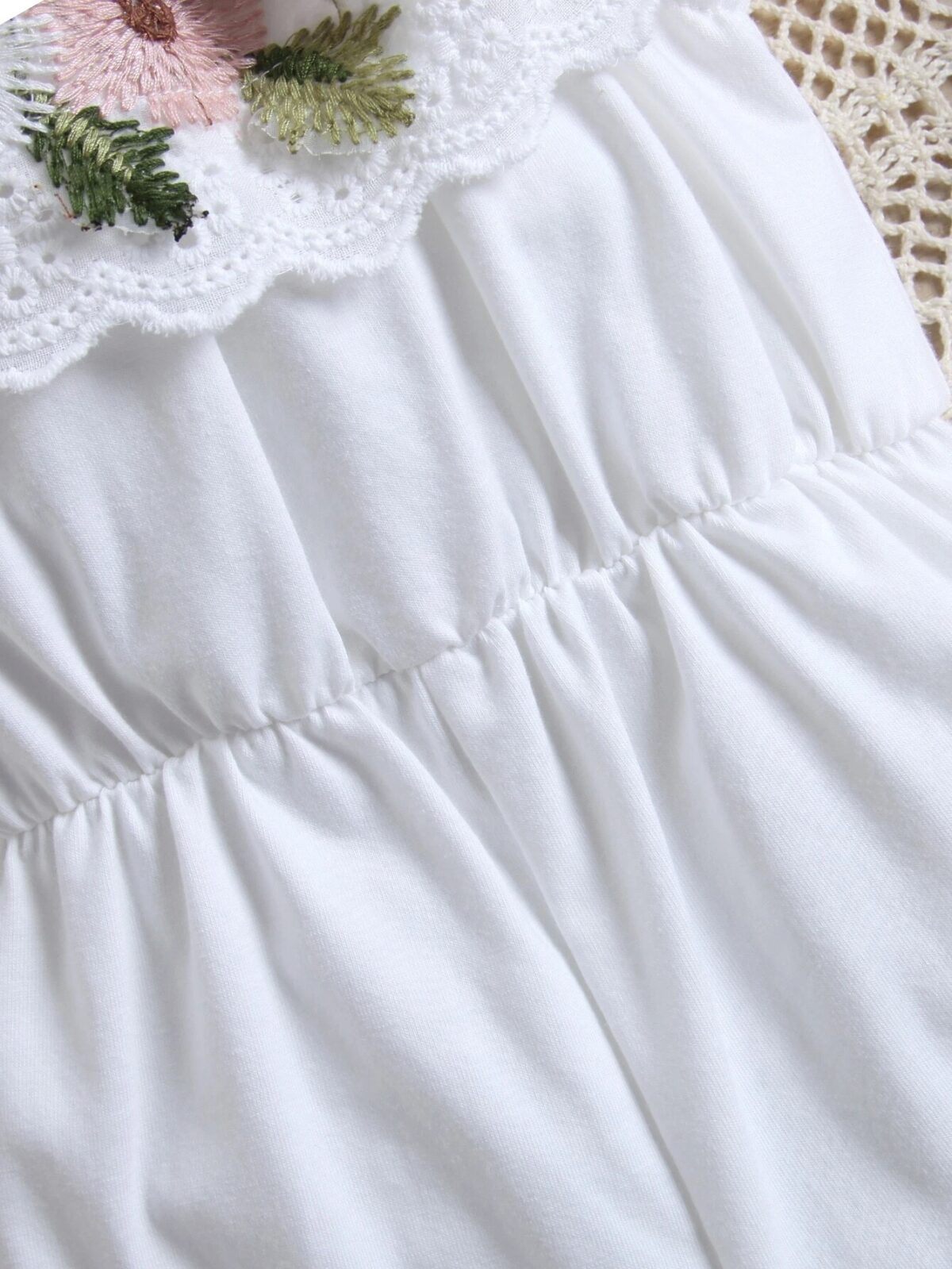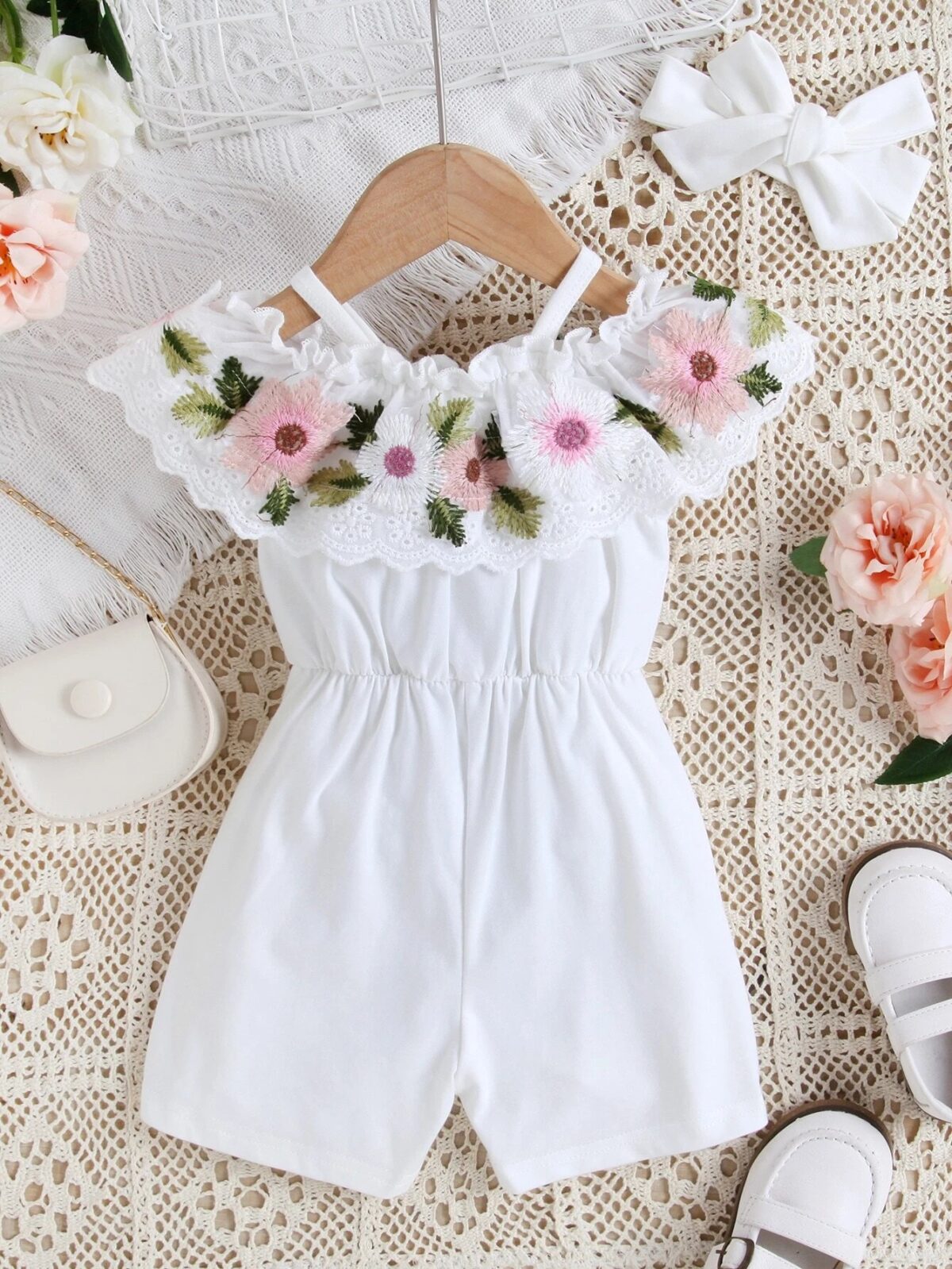 Lovely white baby girl bodysuit with floral embroidery and ruffled neckline, perfect for a fresh and charming look.