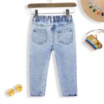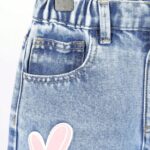Designed for toddler girls, these jeans boast a comfortable fit with a stretchable elastic waistband, perfect for easy dressing and movement. The fabric is a classic light blue denim that offers durability and versatility. The jeans are whimsically decorated with a collection of embroidered accents, featuring multi-colored flowers and hearts scattered along the front of the legs. The flowers in shades of blue, purple, and pink, along with white and pink hearts, inject a fun and girlish flair into the design. These jeans are not only stylish but also functional, with traditional five-pocket styling that adds practicality. The relaxed fit ensures comfort throughout the day, making these jeans an excellent choice for playdates, outings, or simply enjoying a casual day at home..