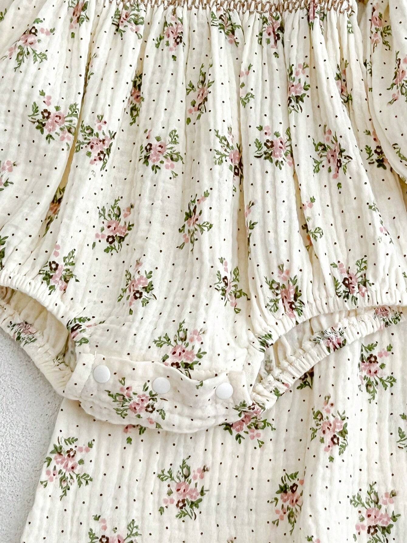 Vintage-inspired floral bodysuit for baby girls with a Peter Pan collar and smocked detailing, perfect for a charming and timeless look.