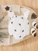 Add a touch of desert charm to your baby girl’s wardrobe with this delightful white romper, featuring playful green cactus prints scattered across the fabric. The romper is designed with ruffled sleeves, adding a sweet and feminine touch to the overall look. Made from soft, breathable fabric, this romper ensures your little one stays comfortable and cool, making it perfect for warm-weather outings. The snap closures at the bottom provide convenience for easy diaper changes, while the loose fit allows for unrestricted movement. Whether for a casual day out or a special occasion, this romper is an ideal choice for a stylish and comfortable outfit.