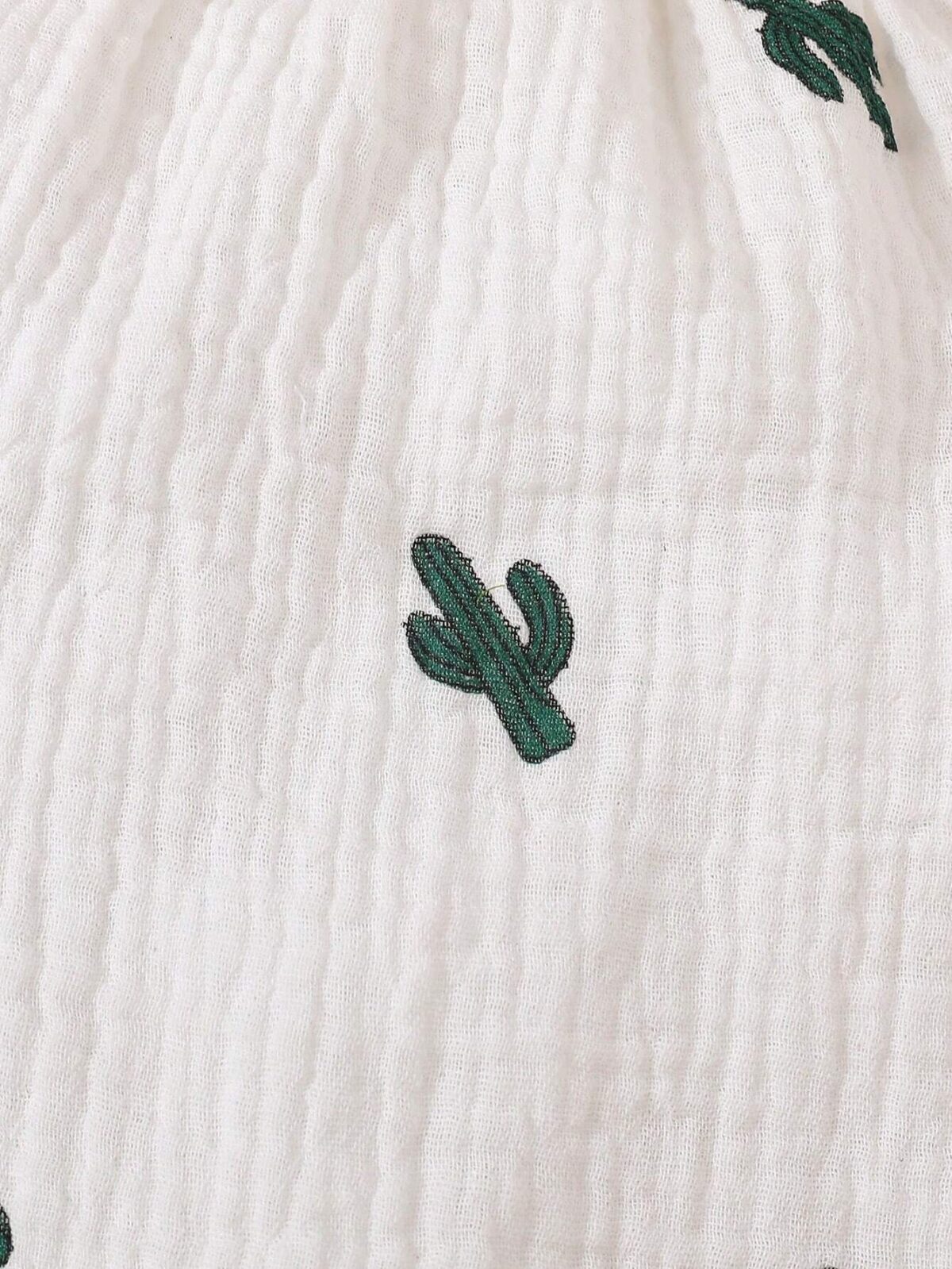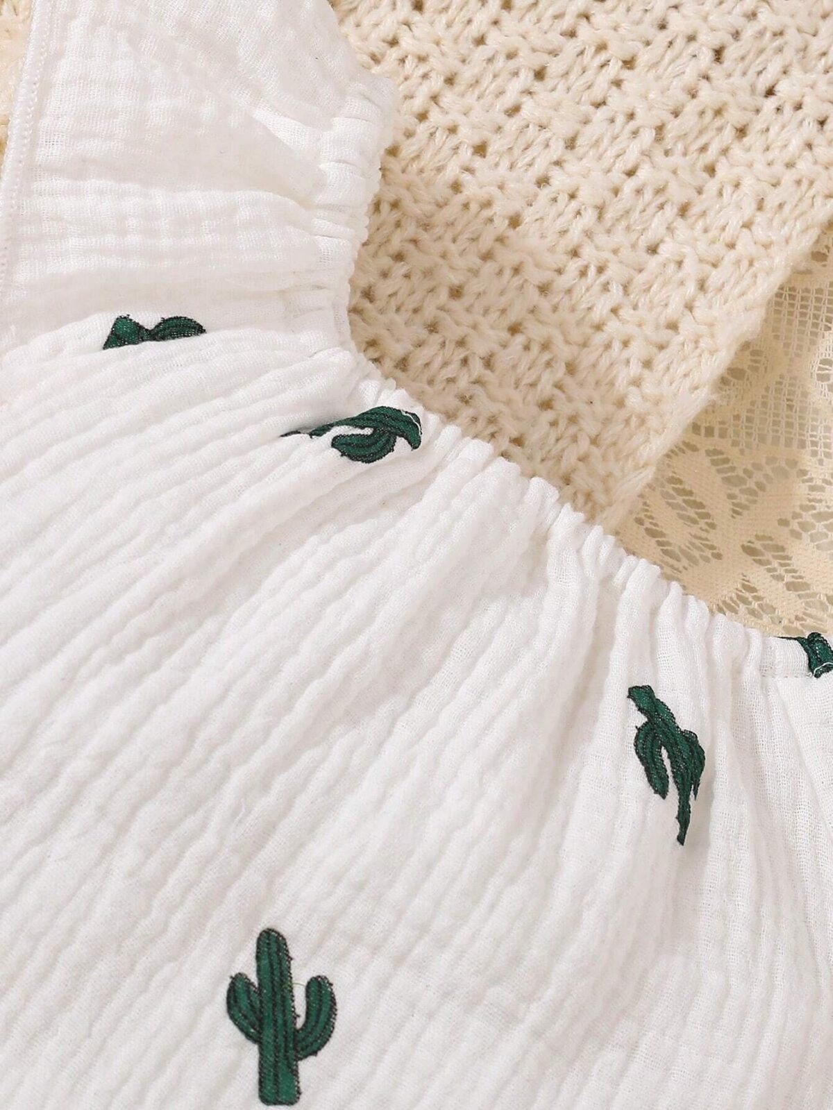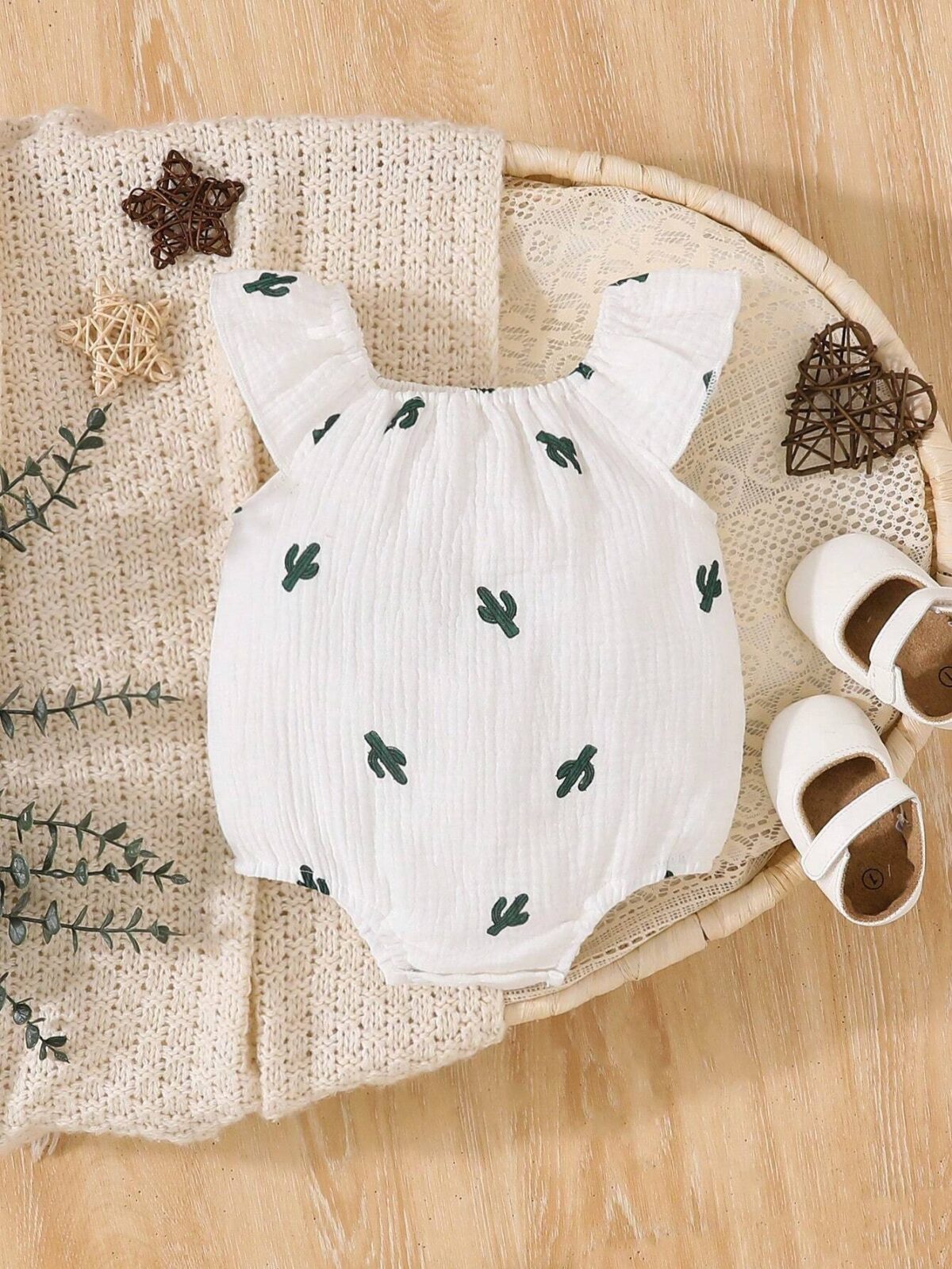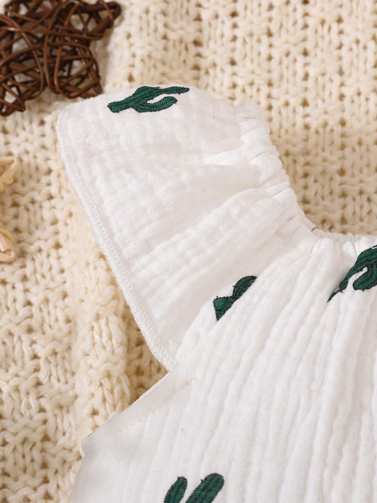 Keep your baby girl cool and stylish in this adorable white romper, adorned with cute green cactus prints and ruffled sleeves.