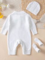 Wrap your baby boy in the ultimate blend of comfort and style with this charming white knit bodysuit set. Featuring a beautifully textured diamond and cable knit pattern, the bodysuit is both cozy and elegant. A cute plaid bow tie adds a touch of sophistication, making it perfect for special occasions. The set includes a matching hat and snug booties, ensuring your little one stays warm and stylish from head to toe. Ideal for photoshoots, family gatherings, or simply lounging at home, this bodysuit ensemble is a delightful addition to any baby’s wardrobe.