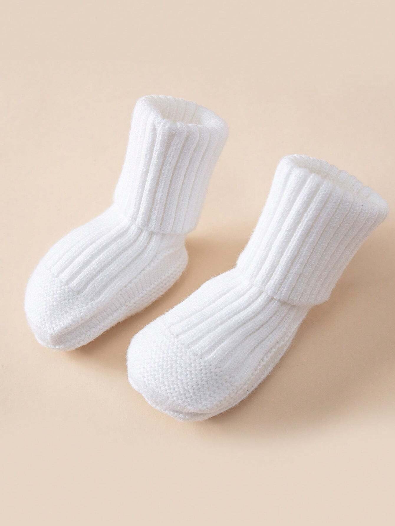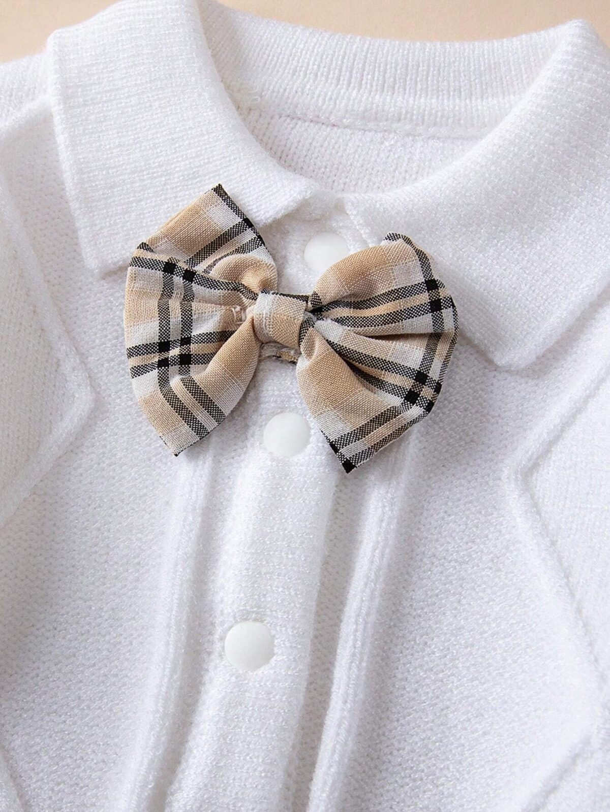 Dress your little one in this adorable white knit bodysuit, complete with a plaid bow tie, matching hat, and cozy booties for a perfect ensemble.