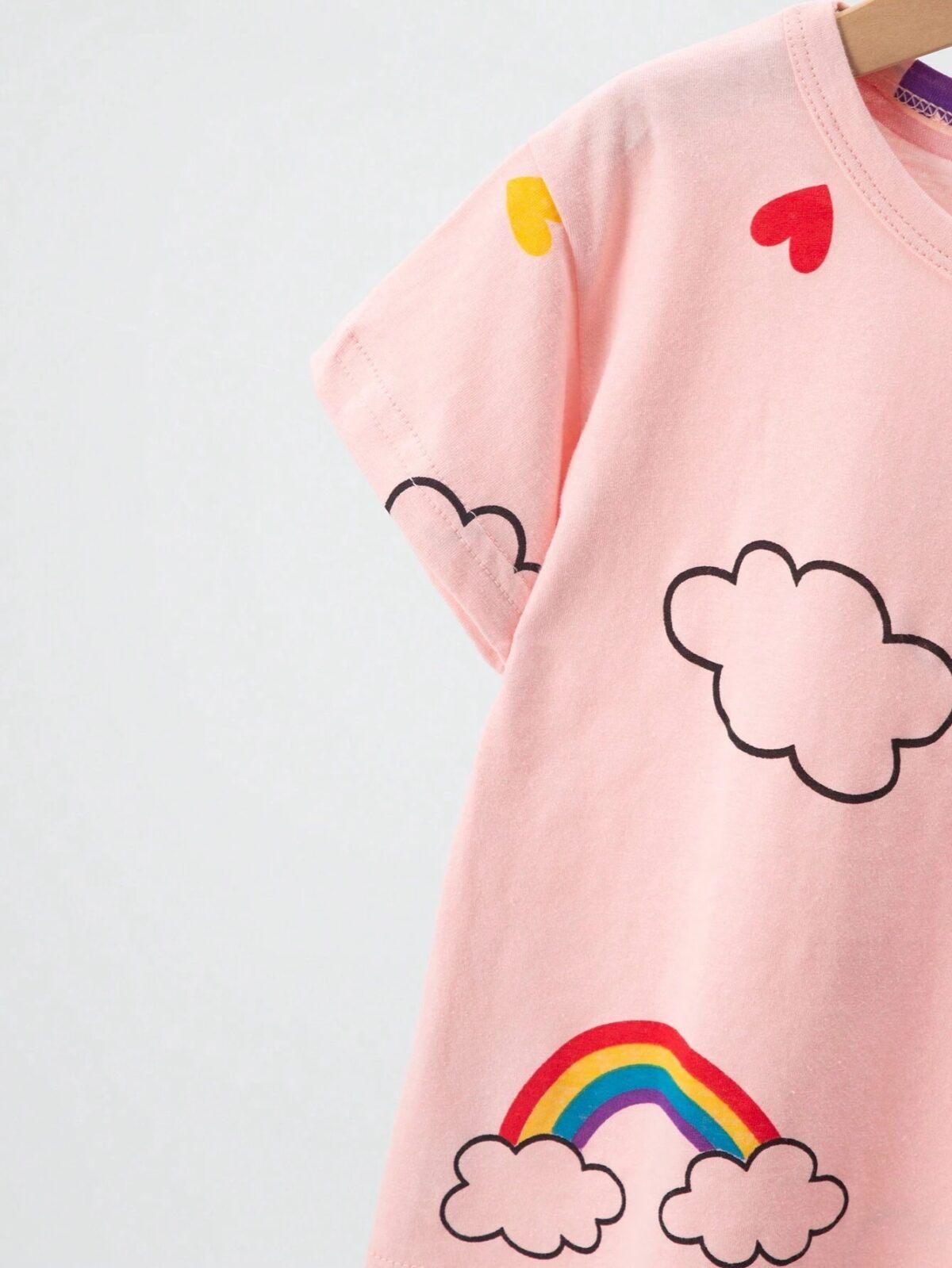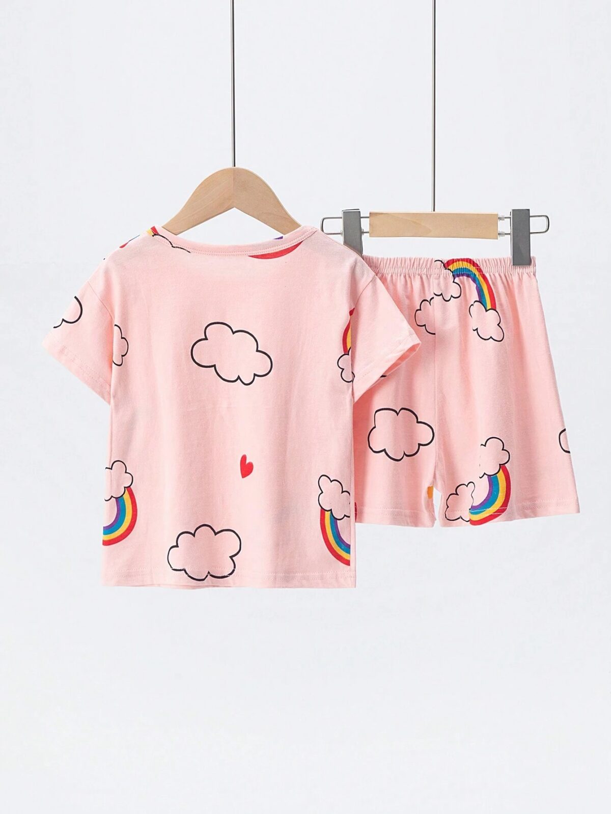 Drift off into a world of dreams with this charming 2-piece pajama set. The set includes a short sleeve top and matching shorts, both adorned with delightful prints of rainbows, clouds, and hearts. The vibrant and playful design adds a splash of color to bedtime, making it a favorite for little ones. Crafted from soft, breathable fabric, this pajama set ensures maximum comfort and a restful night’s sleep. The top features a relaxed fit and a round neckline, while the shorts come with an elastic waistband for easy wear. Perfect for warm nights or lounging around the house, this pajama set combines cuteness and comfort in the best way possible.