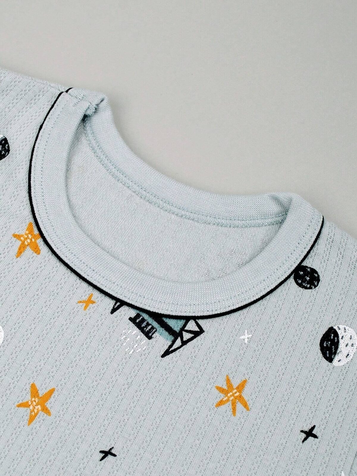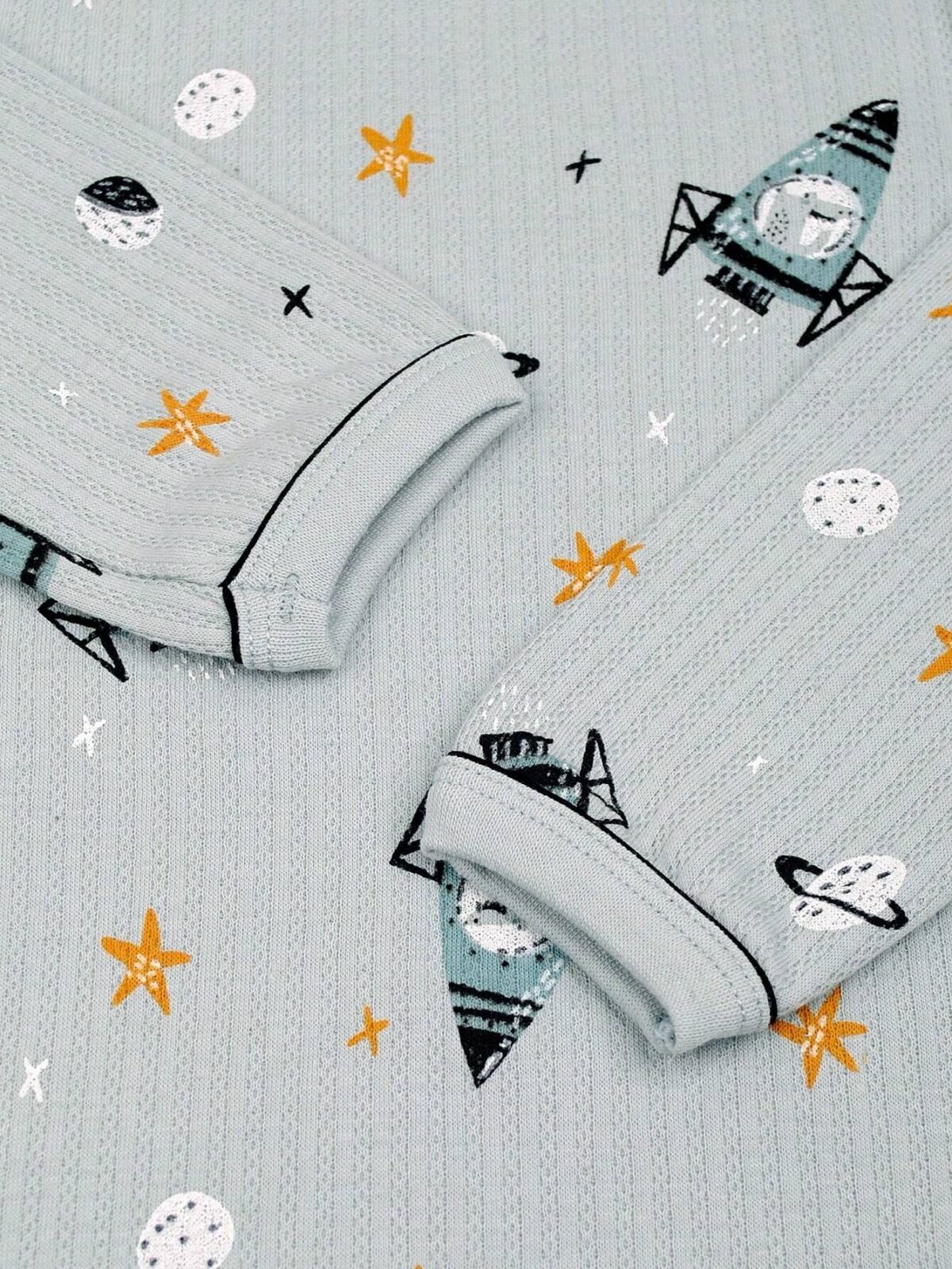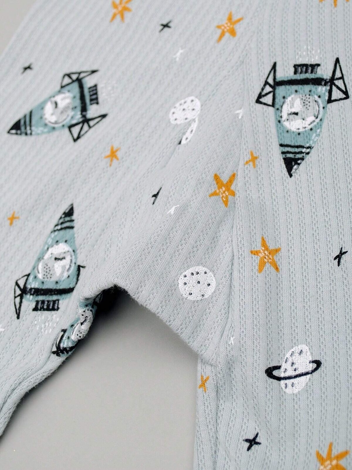 Cozy rocket-themed pajamas in soft gray for young boys.