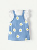 Dress your little one in this adorable daisy denim romper, featuring a playful print and ruffled sleeves, perfect for sunny days.