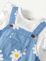 This charming daisy denim romper is an ideal addition to your baby girl’s wardrobe, combining cute design with practicality. The romper features a soft, light blue denim fabric adorned with cheerful white and yellow daisy prints, creating a delightful and playful look. It includes adjustable shoulder straps with wooden buttons for a secure and comfortable fit. The romper is paired with a white top featuring ruffled sleeves that add an extra touch of sweetness. A convenient front pocket enhances the romper’s functionality, making it perfect for active little ones. Ideal for sunny days, this romper is perfect for outdoor play, family outings, or casual gatherings. The soft, breathable fabric ensures comfort and ease of movement, while the adorable design makes your little girl stand out. Pair it with cute sandals and a sun hat for a complete, picture-perfect summer outfit.