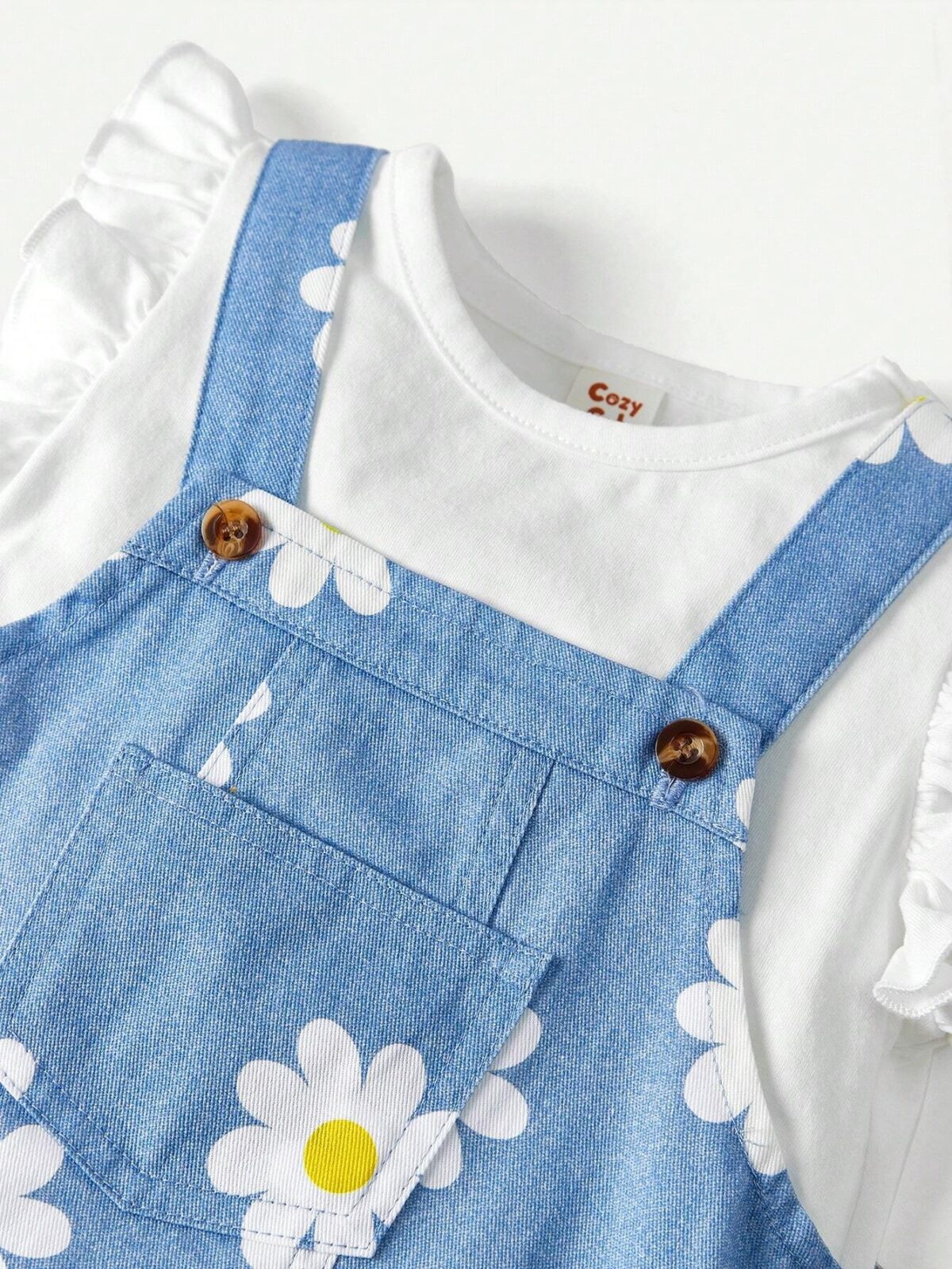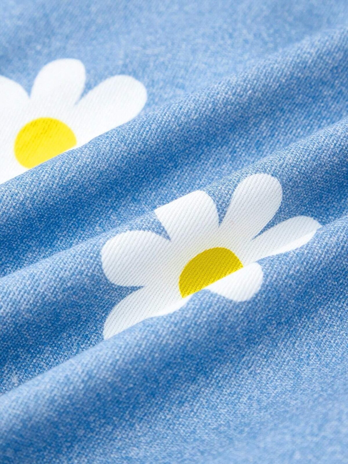 Dress your little one in this adorable daisy denim romper, featuring a playful print and ruffled sleeves, perfect for sunny days.